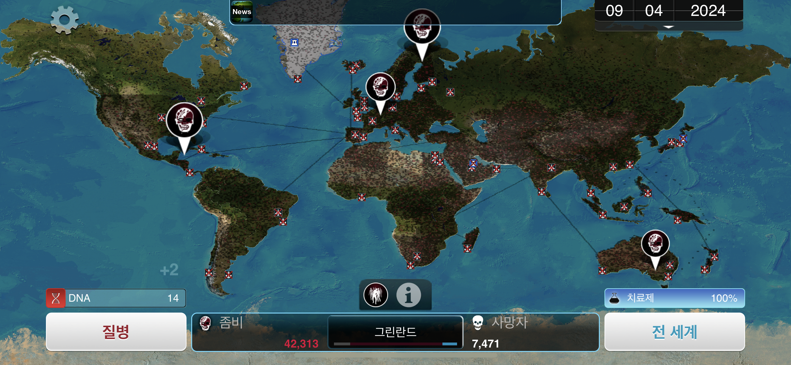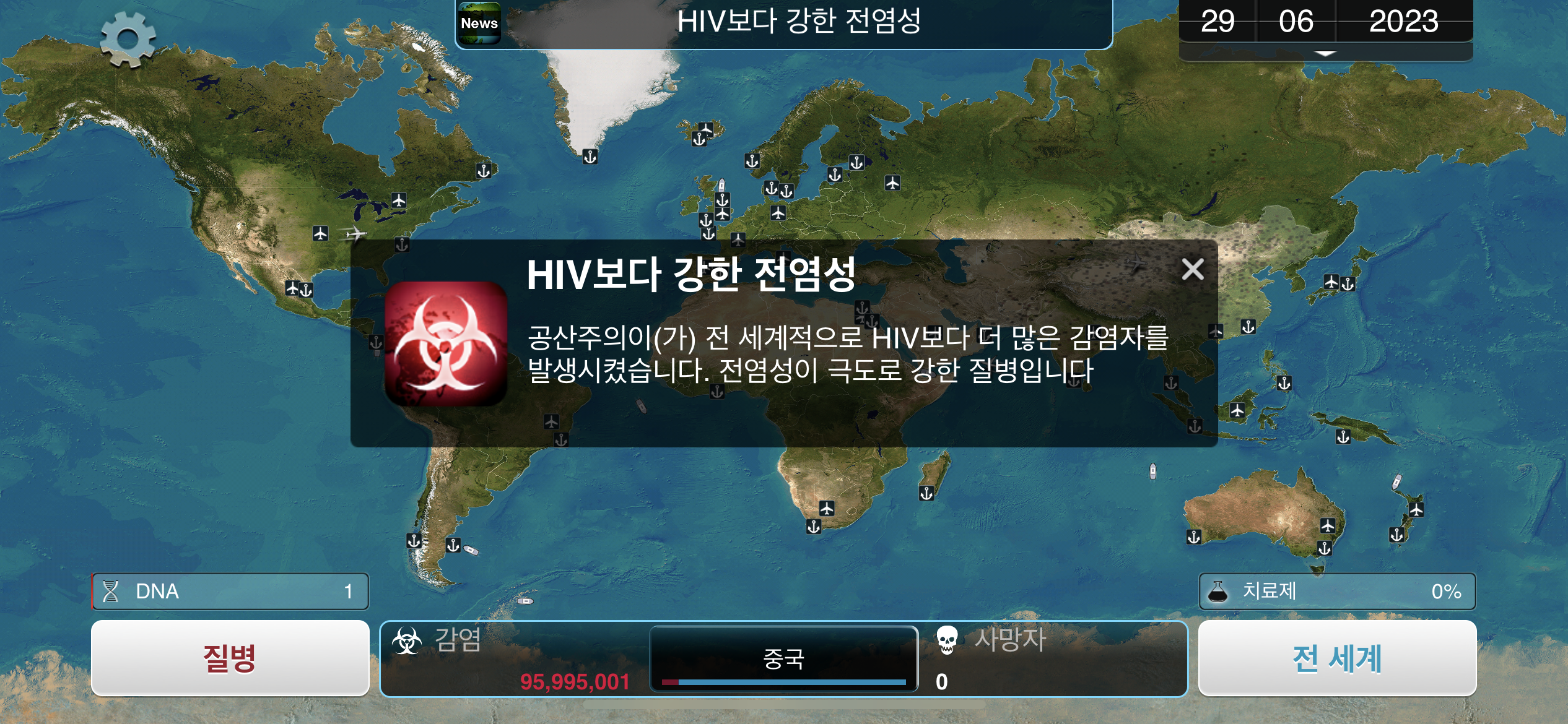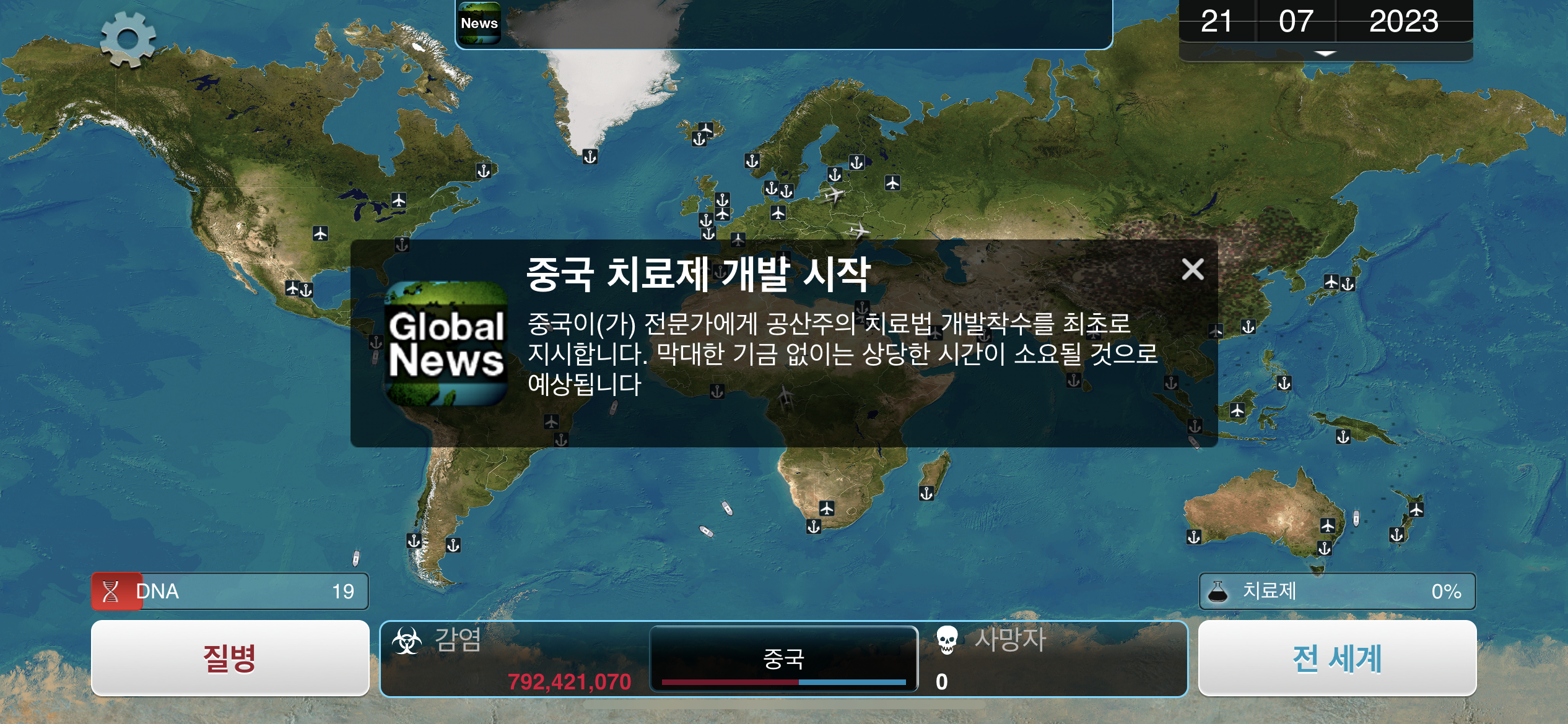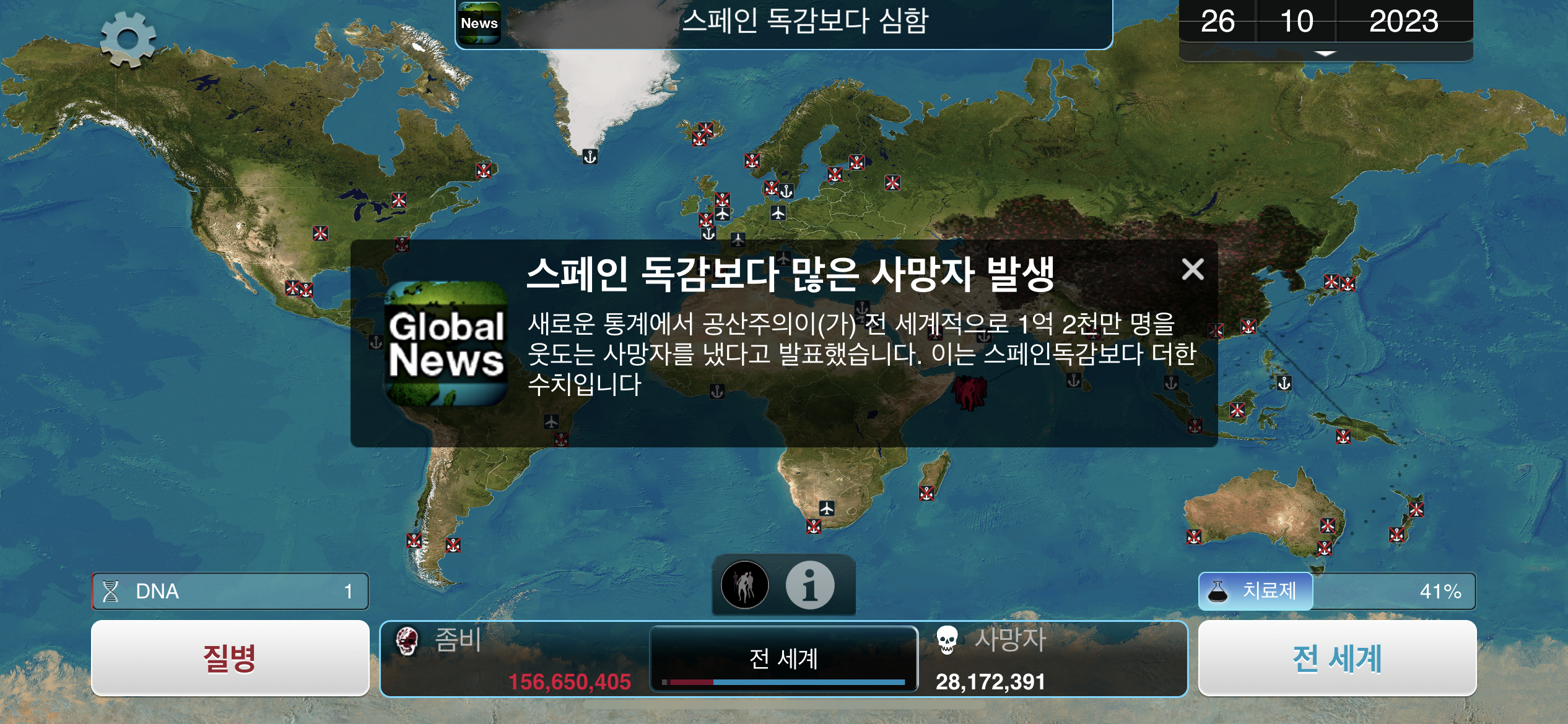 42. 2023년 12월 1일. 치료제가 75%까지 완성되었고, 모든 대륙의 큰 국가에는 좀비가 정착했습니다.