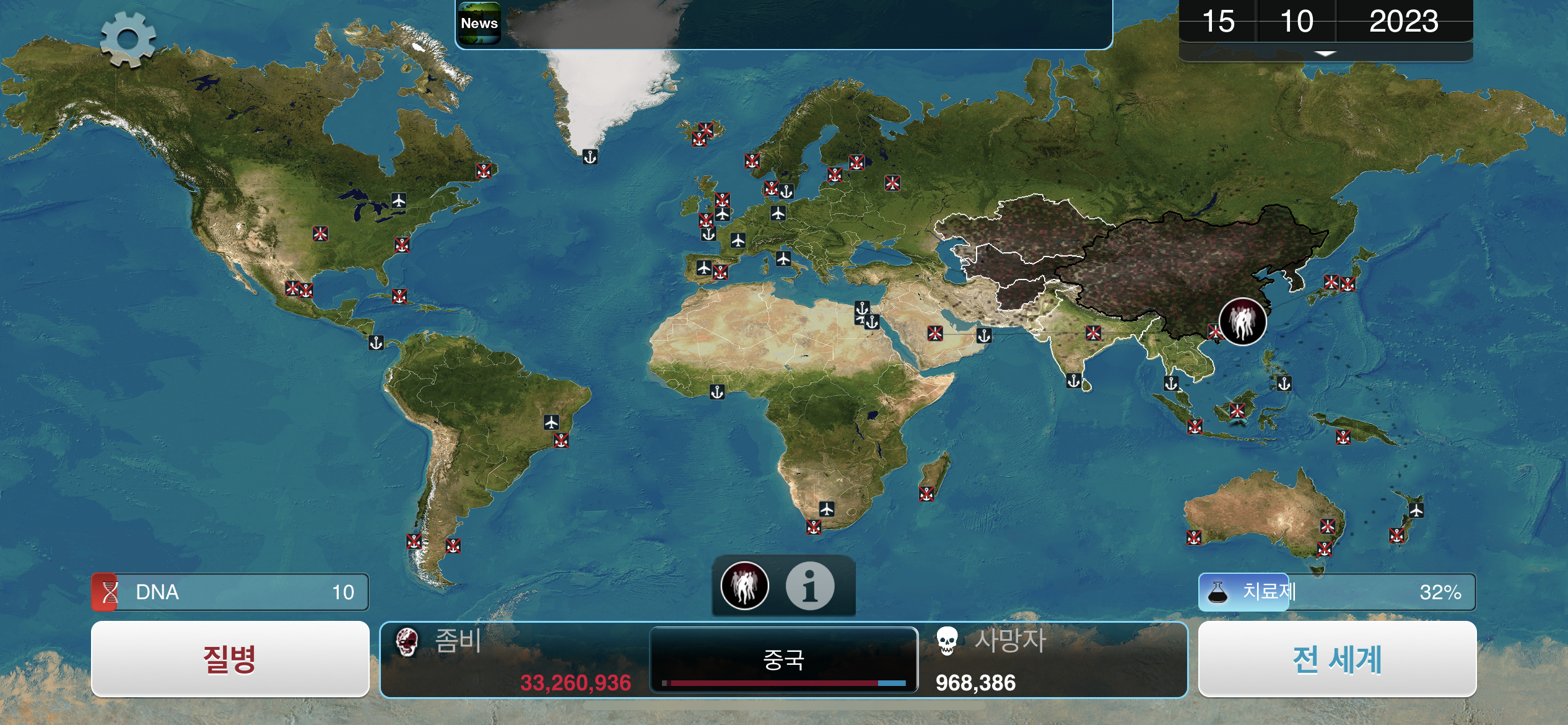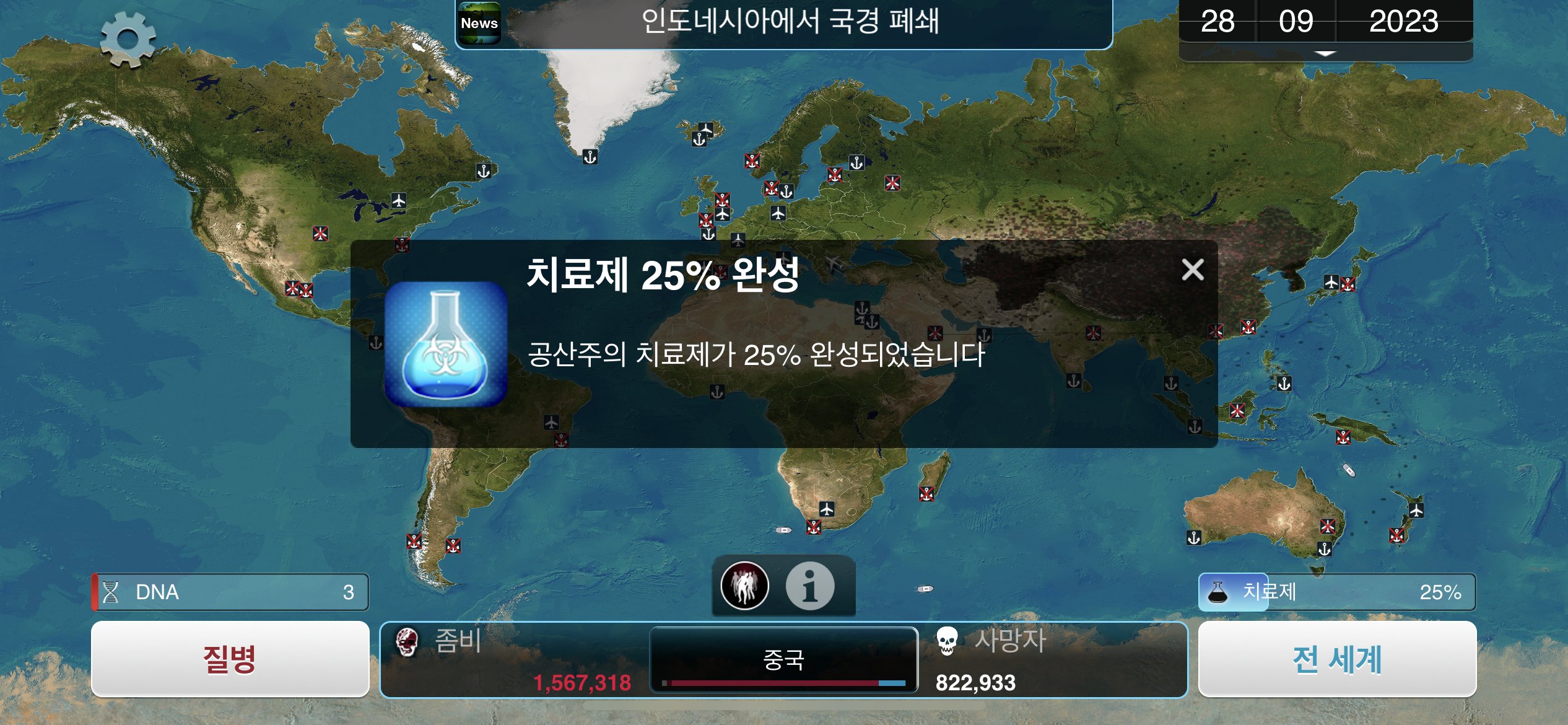 29. 2023년 9월 28일. 중국에서의 좀비가 150만명까지 늘어납니다. 치료제는 25%가 완성됐네요.