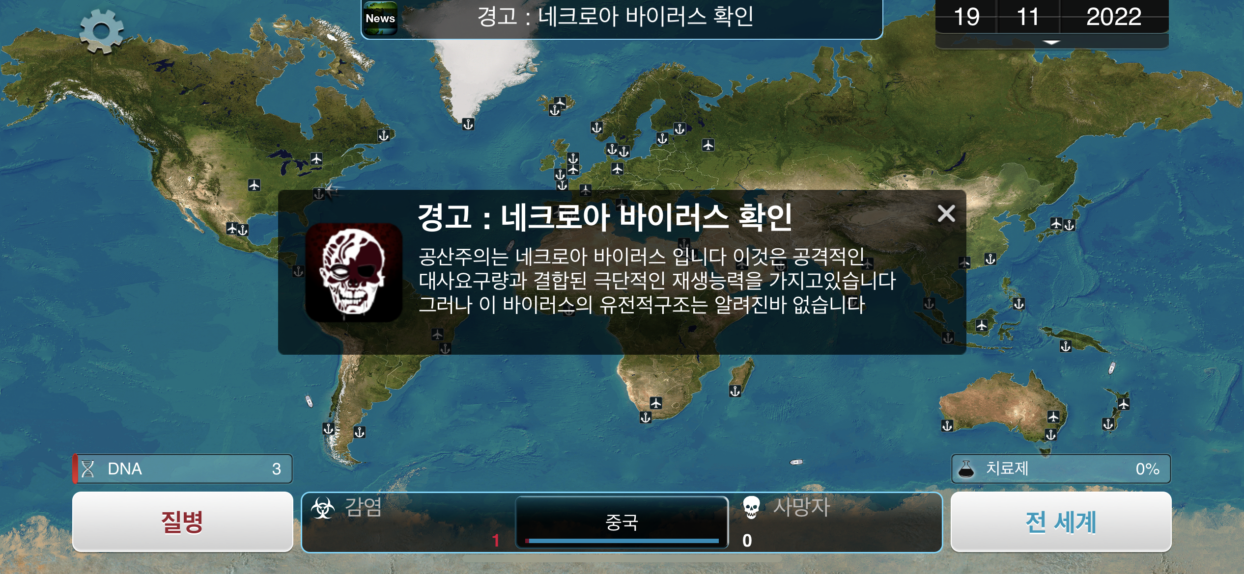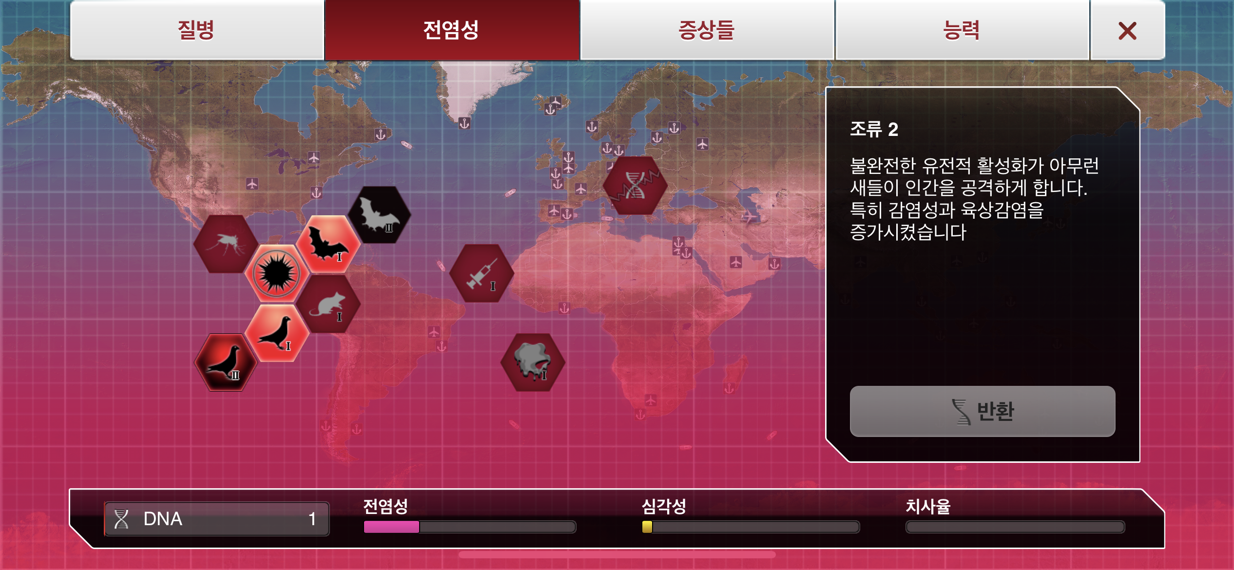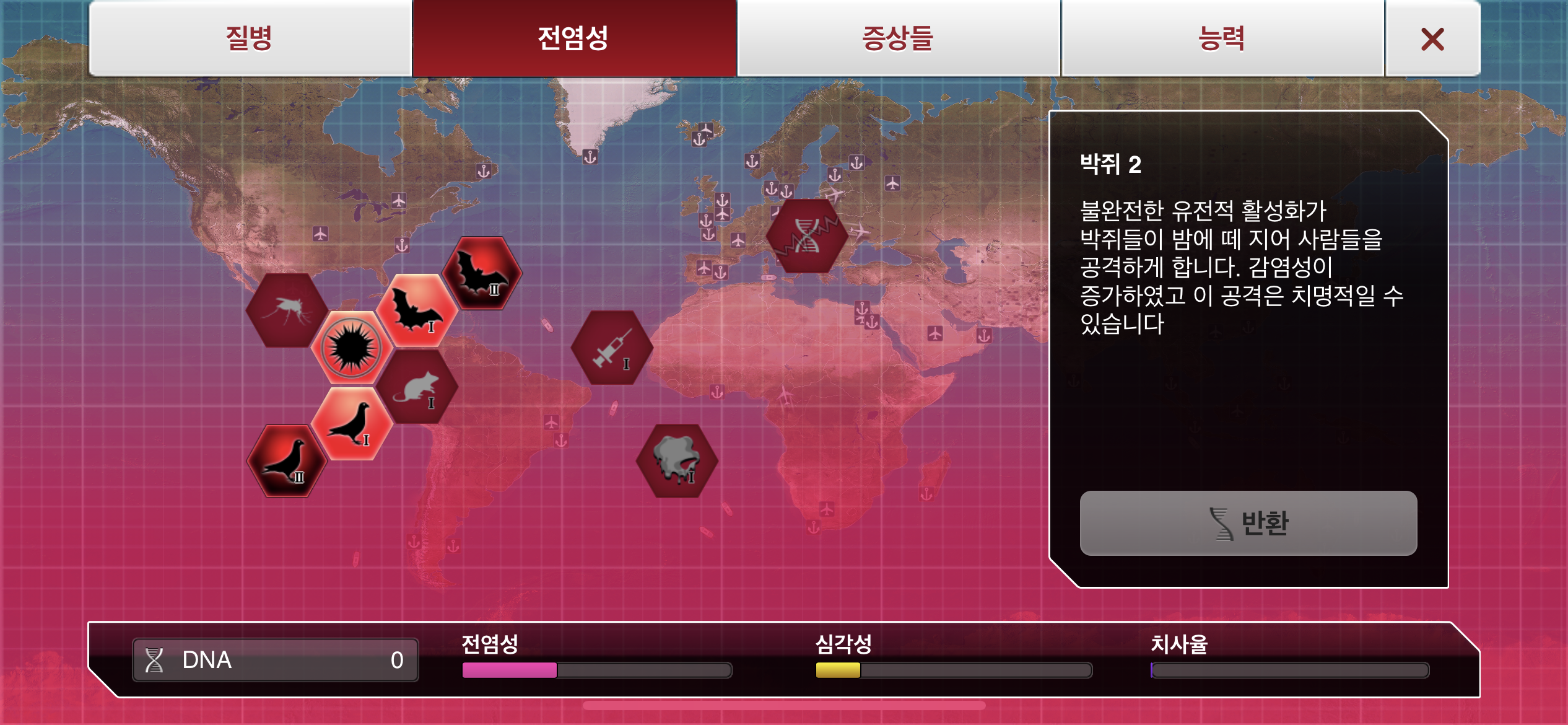 *박쥐2를 진화하면 박쥐들이 떼를 지어 사람들을 공격하기 시작합니다. 이때부터 사망자 수가 발생하며 전 세계적인 대응이 서서히 시작됩니다.
