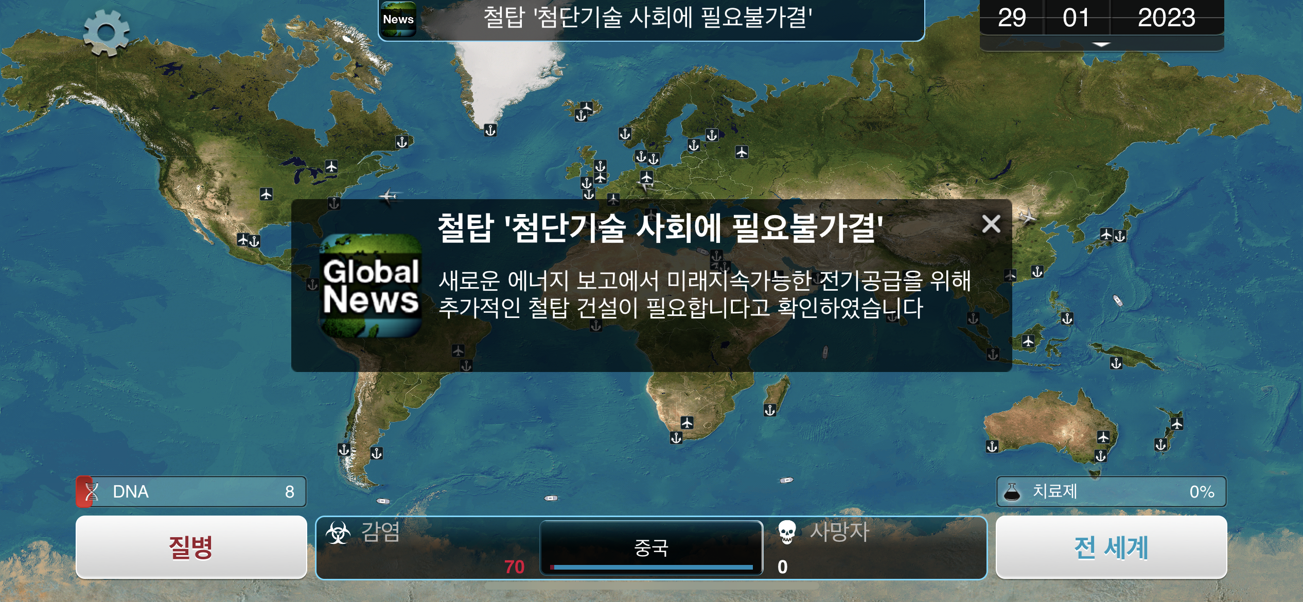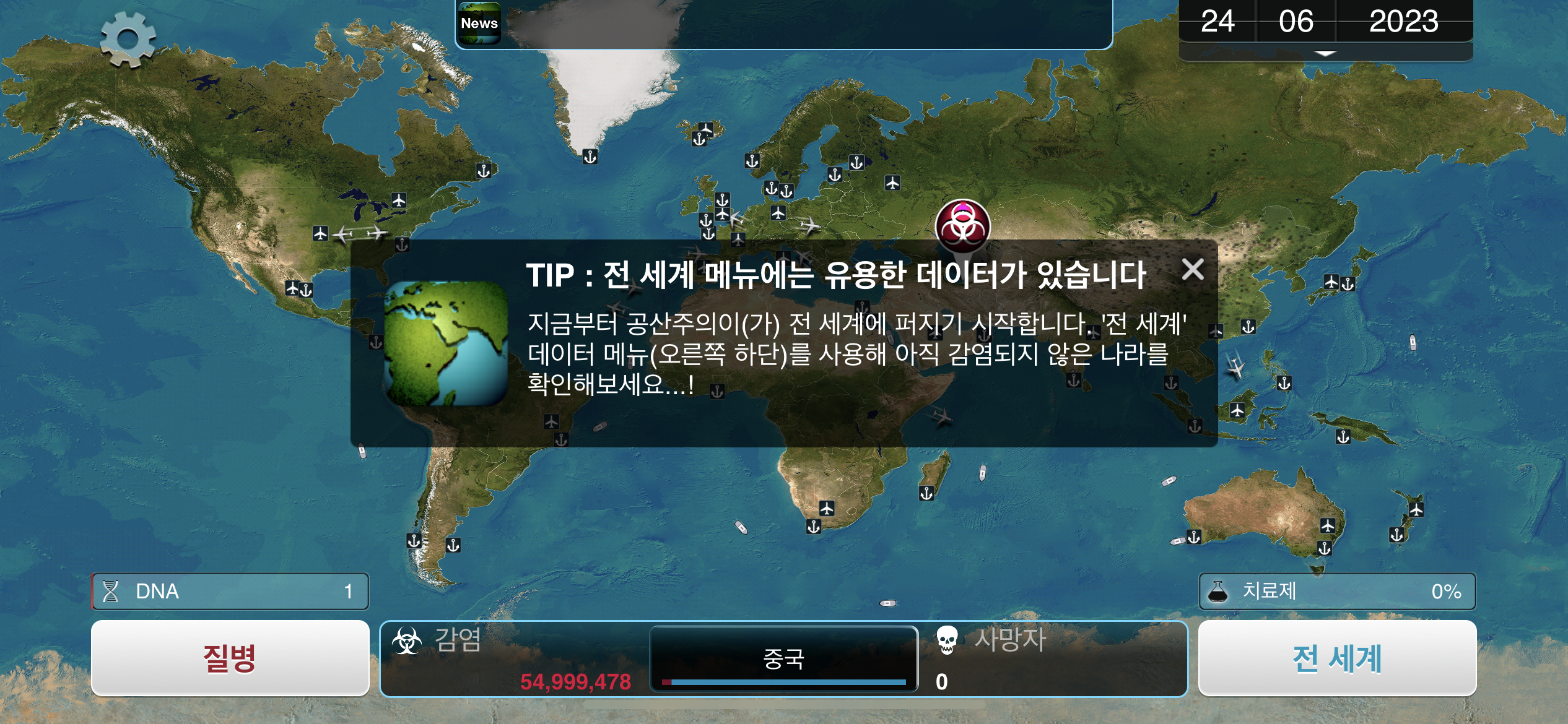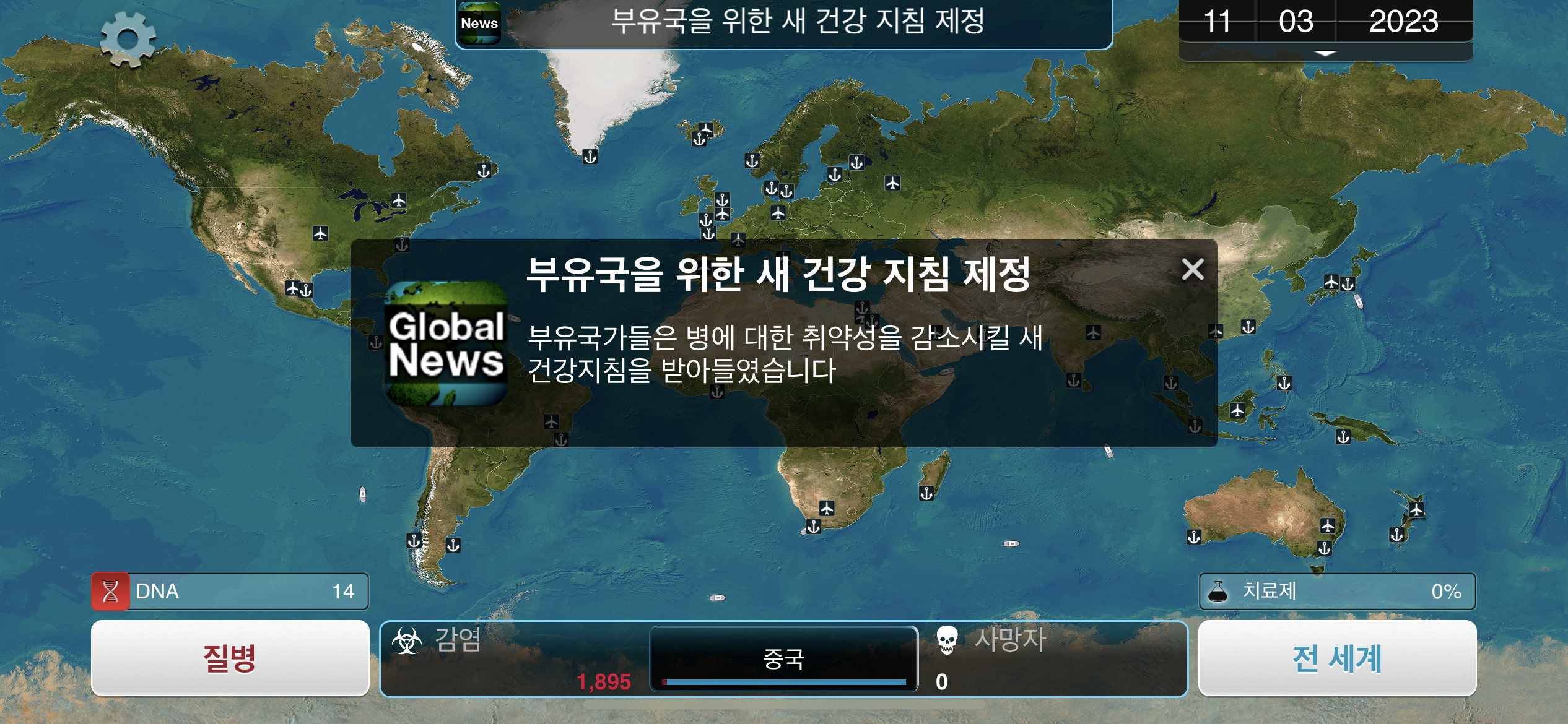 *박쥐2를 진화하면 박쥐들이 떼를 지어 사람들을 공격하기 시작합니다. 이때부터 사망자 수가 발생하며 전 세계적인 대응이 서서히 시작됩니다.