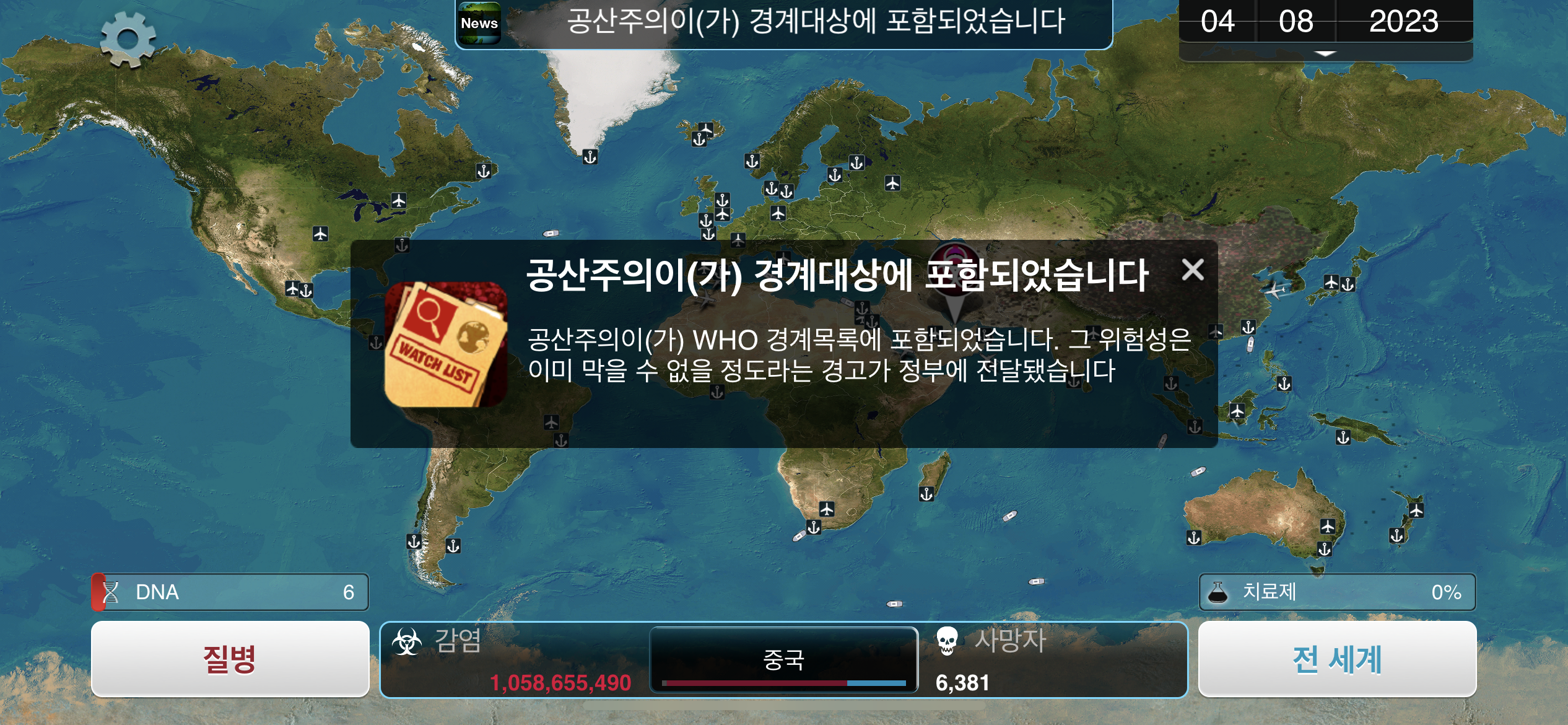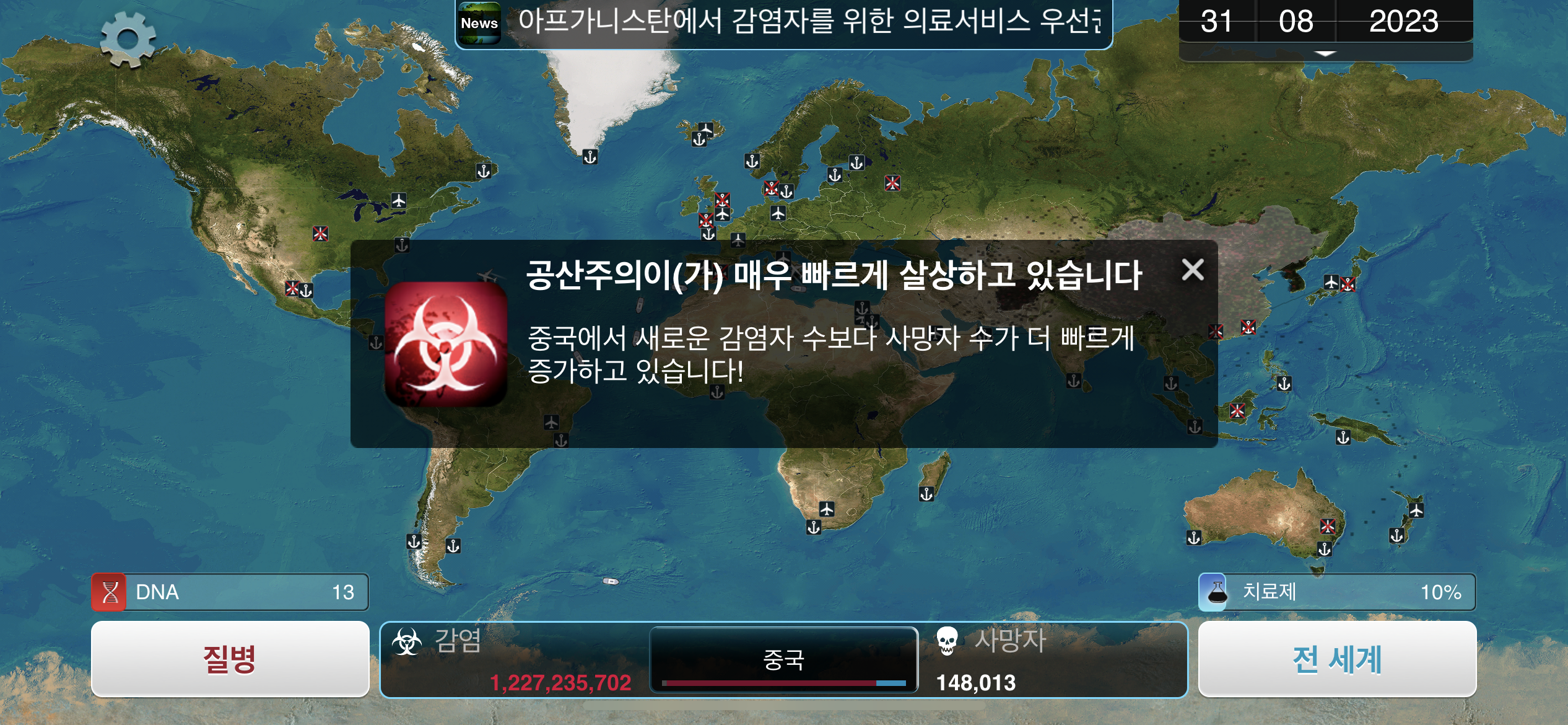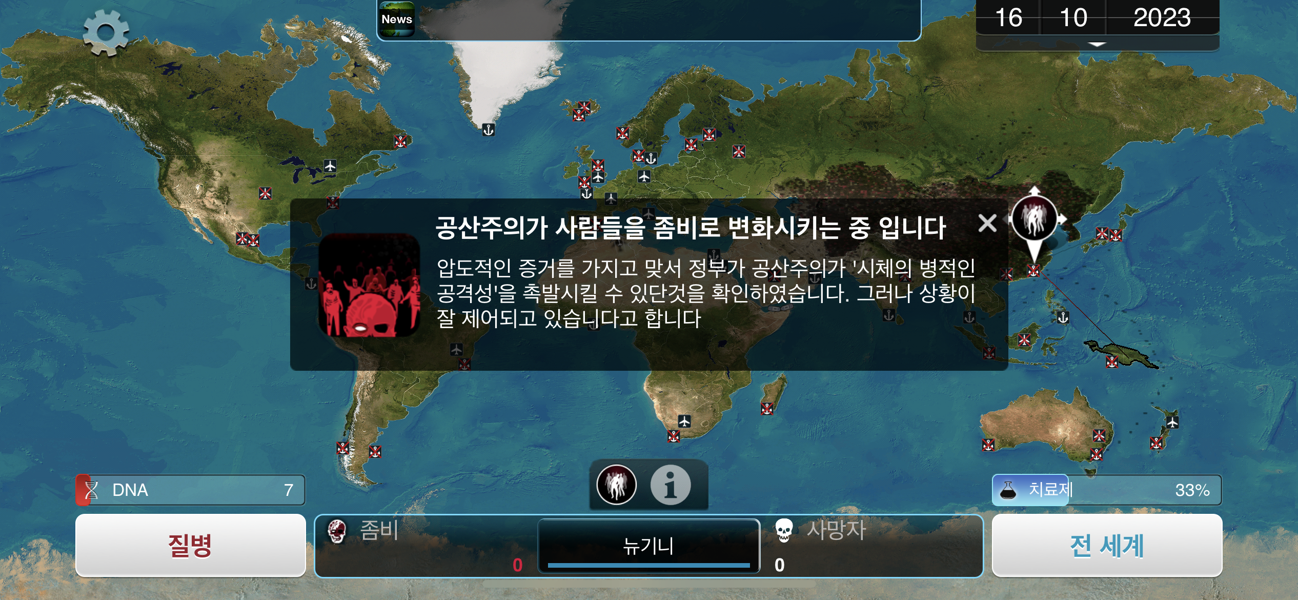 34. 2023년 10월 16일. 공산주의가 사람들을 좀비로 변화시키는 중 입니다. 동남아시아 국가들을 확인하고 아직 좀비가 없는 국가에는 중국에서부터 좀비를 이동시킵니다. 오세아니아도 확인하여 좀비가 없는 국가에 좀비를 집어넣으면 됩니다.