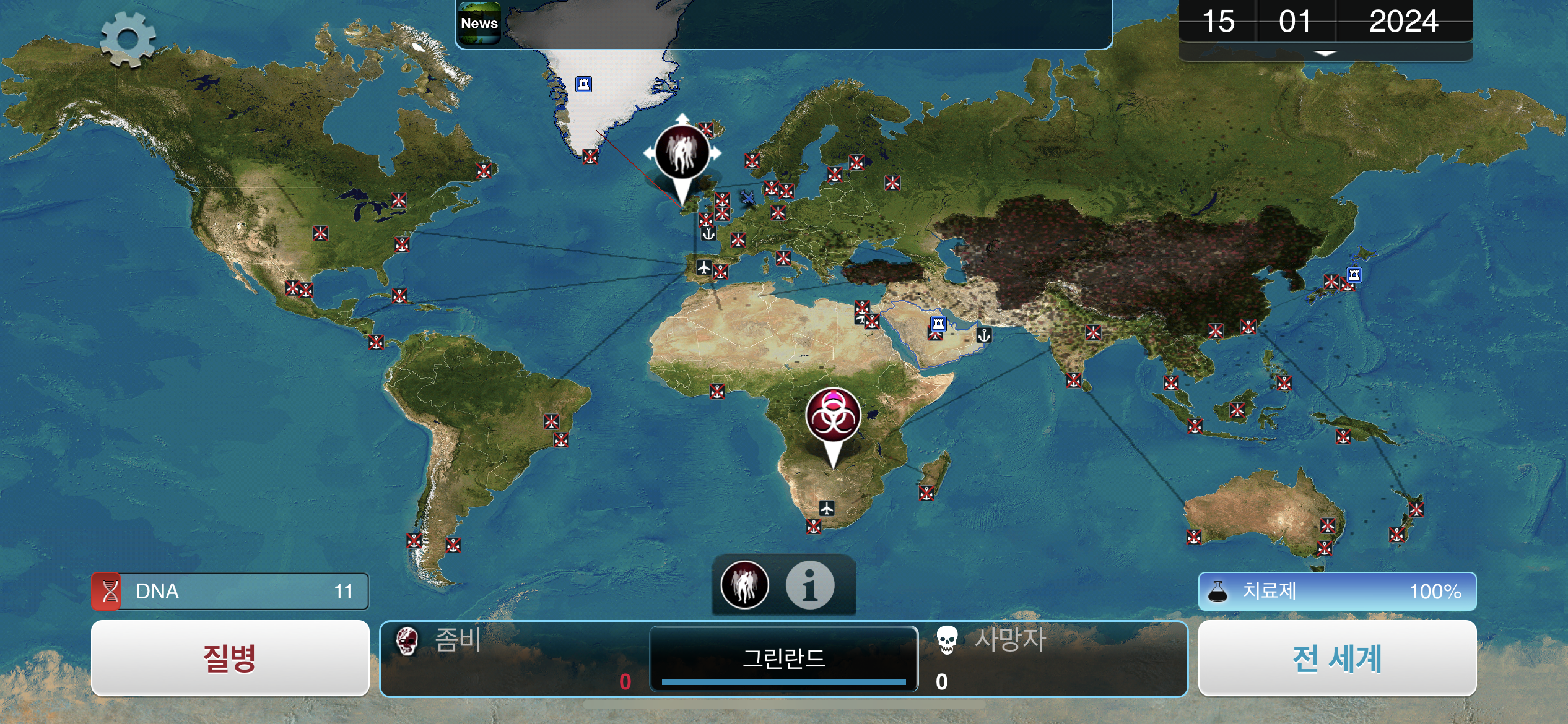 54. 이쯤되면 건강한 국가들 목록이 깨끗해야 합니다. 아직도 건강한 국가가 있다면 서둘러 좀비를 이동시켜주세요!