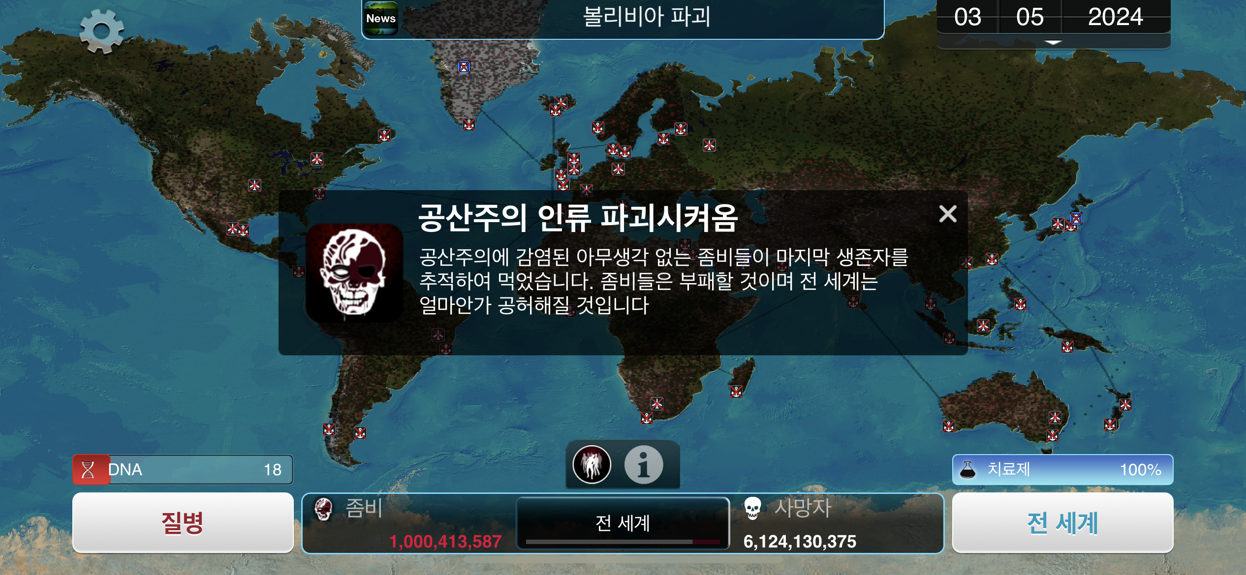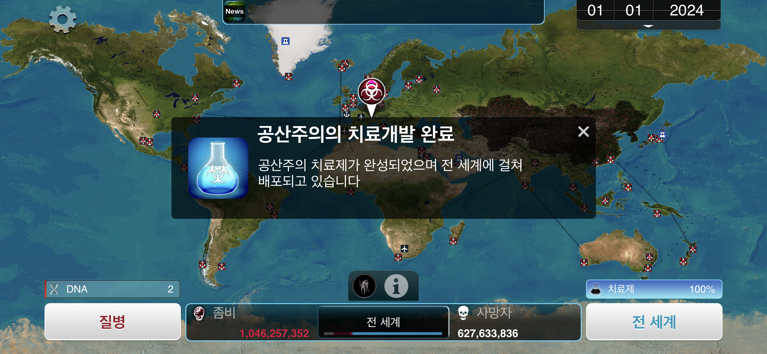 47. 2024년 1월 1일. 새해를 맞이하며 치료제가 완성되었습니다. 전 세계의 좀비는 현재 10억마리 입니다.