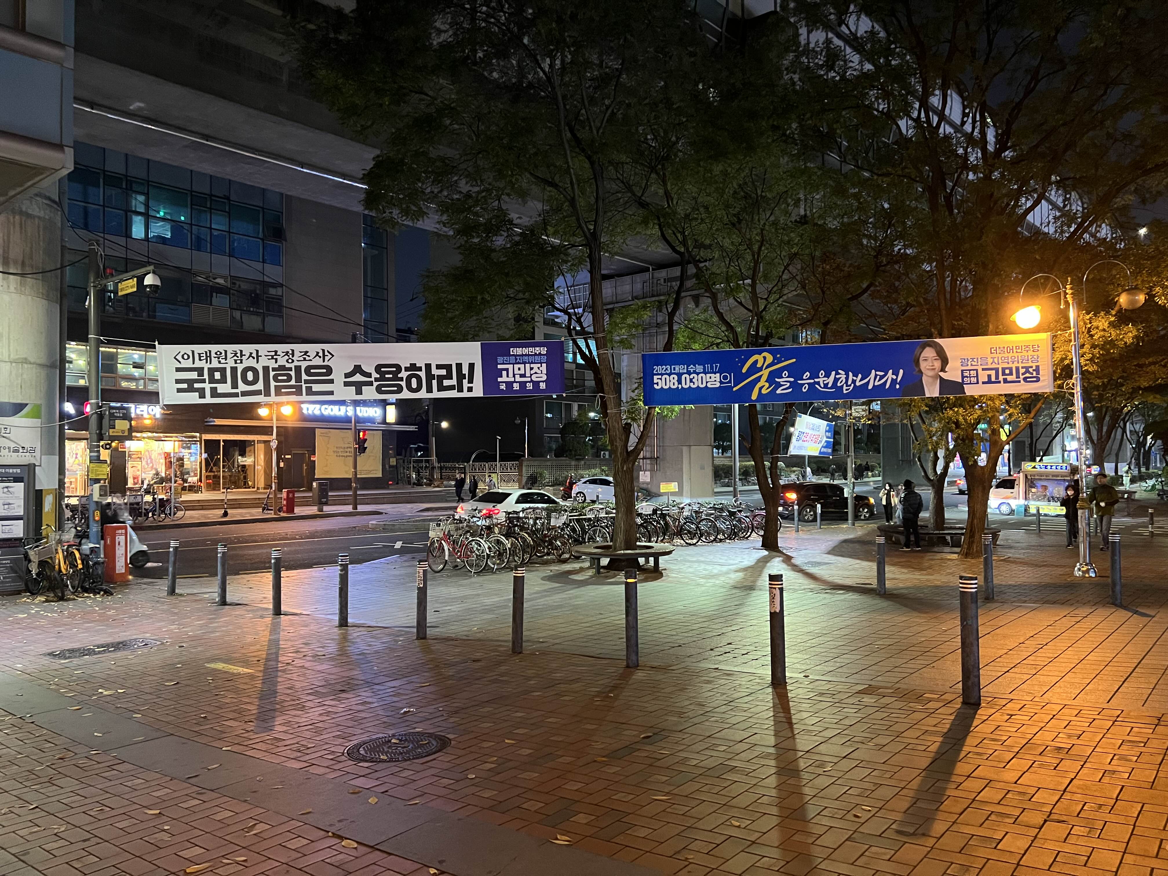 고민정 의원의 11월 네번째 현수막인, 왼쪽 현수막은 이번 할로윈 데이에 발생했던 이태원 사고에 관한 현수막이네요.