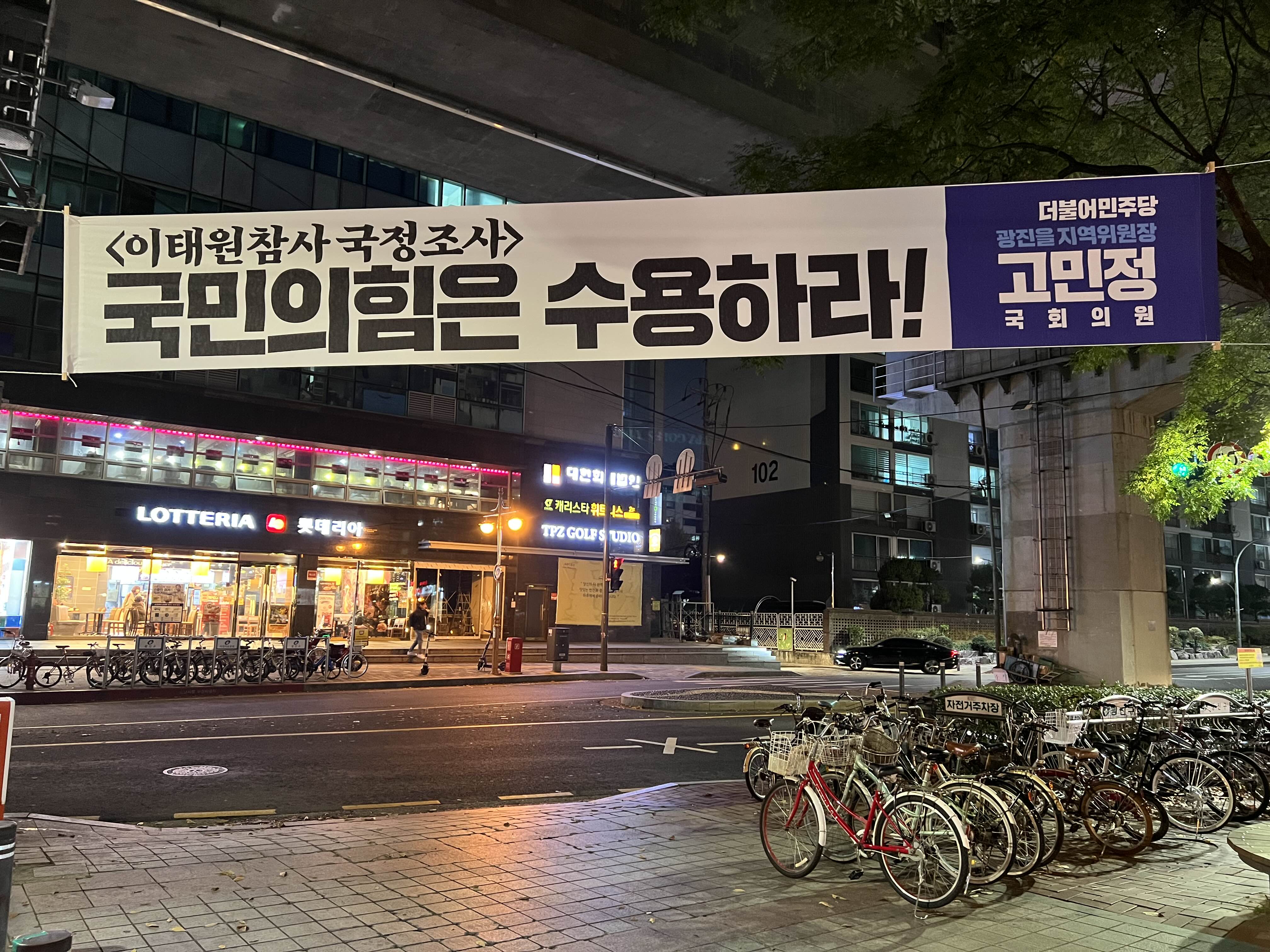 뚝섬유원지역 1번 출구앞 고민정 의원의 현수막이 게시 되었습니다. 이번 이태원 사고로 추모 현수막을 게시했는데요, 저 또한 이 사고로 인한 사망자들의 명복을 빕니다. 더불어민주당 국회의