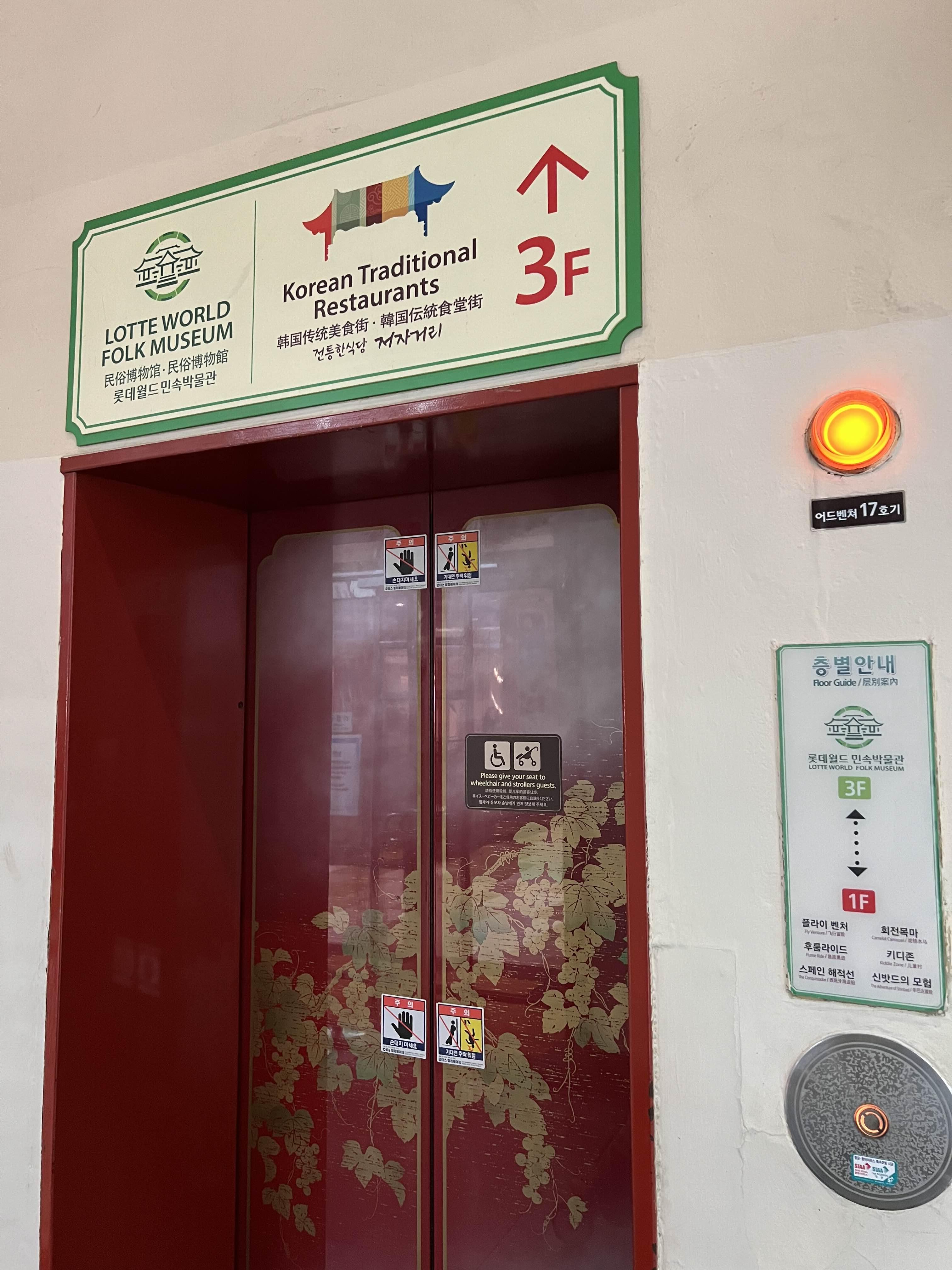롯데월드 실내에 있는 비밀 엘리베이터. ㅎㅎㅎㅎ 민속박물관으로 갈 수 있는 3층까지 왕복 운행합니다.