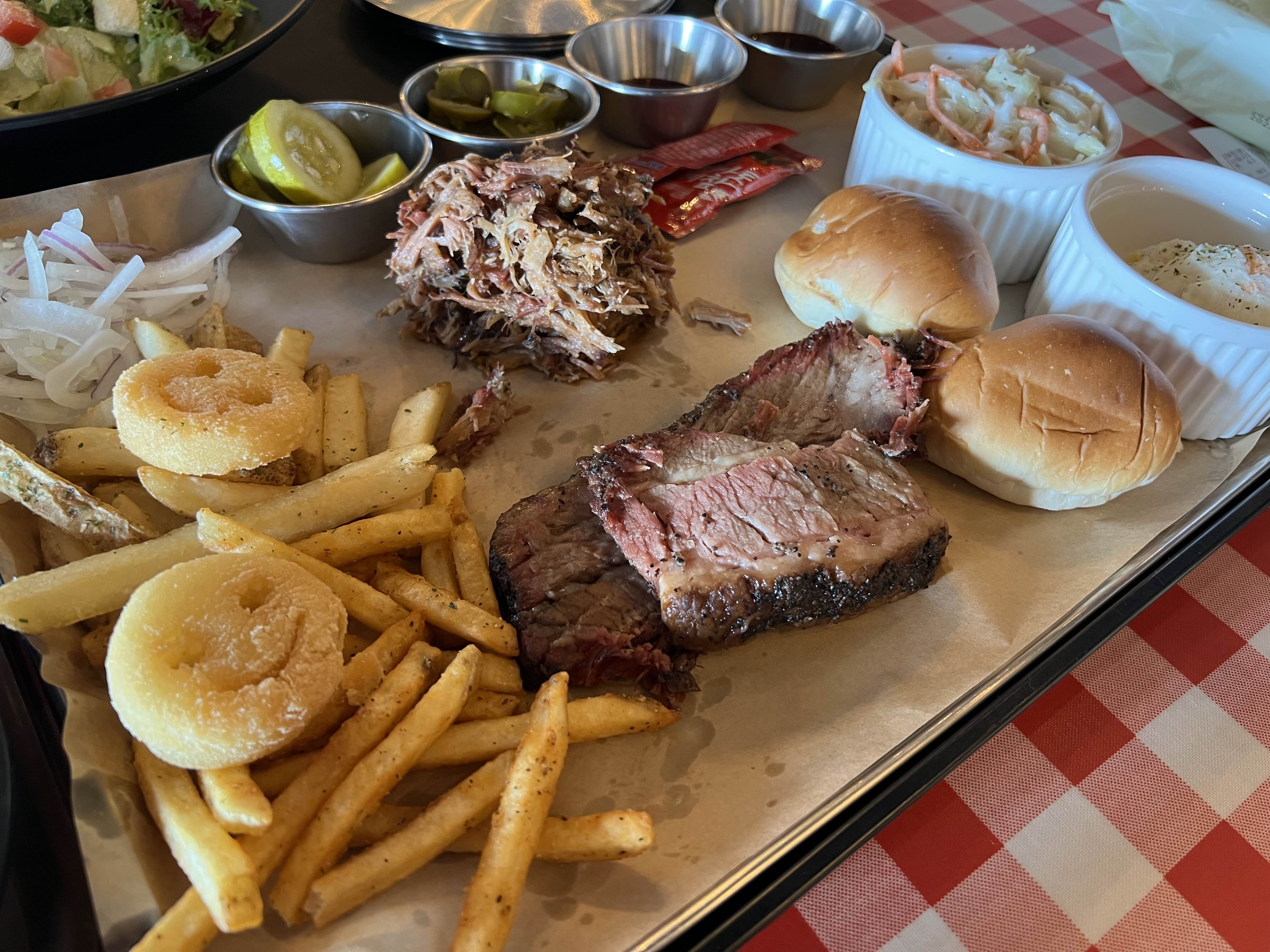 윤기가 좔좔 흐르는 브리스킷(오른쪽)과 풀드 포크(왼쪽)