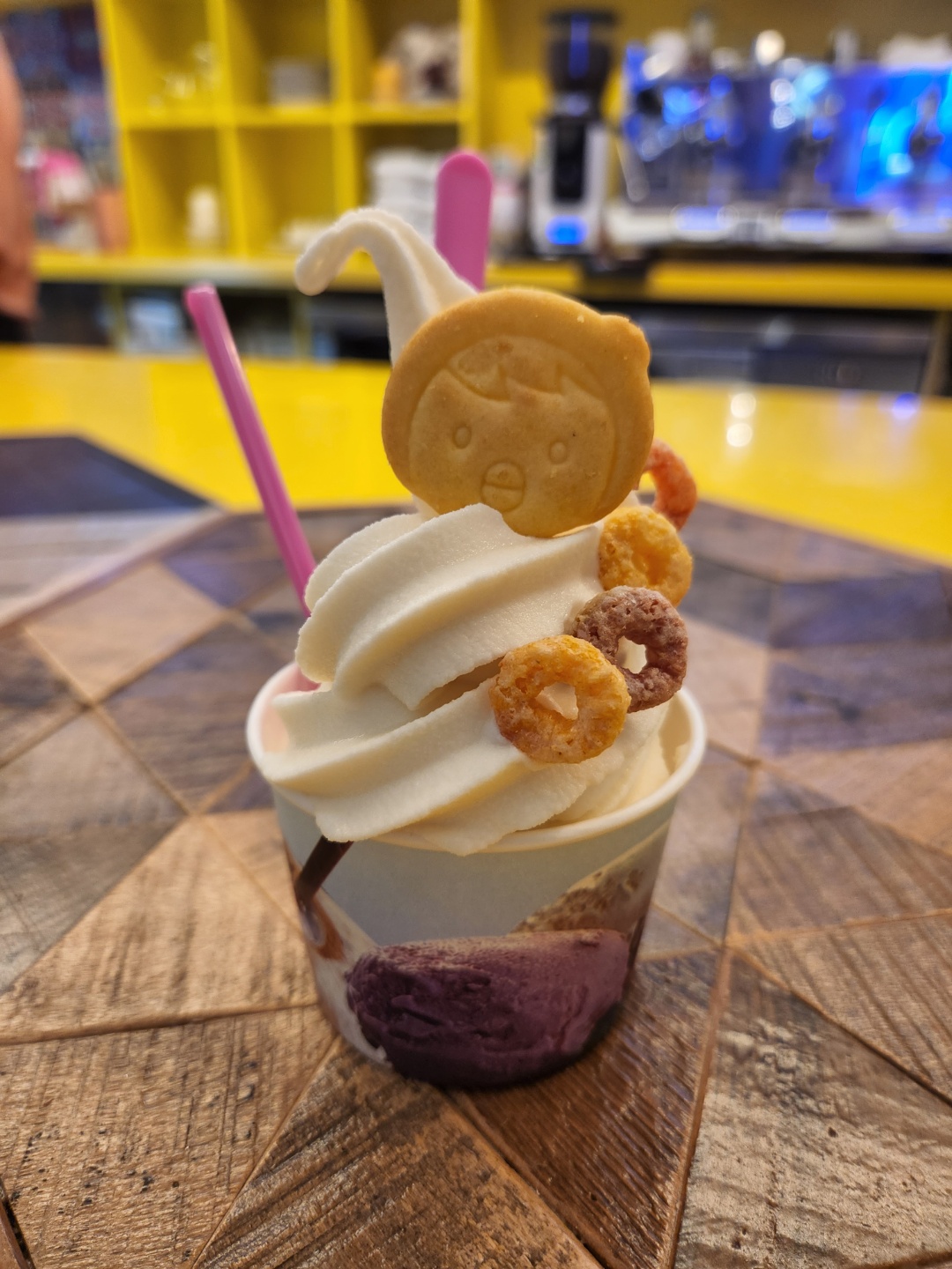 아가가 좋아하는 뽀요요 과자가 꽂혀 있는 귀여운 아이스크림 ㅎㅎㅎㅎ 아가는 달달한 아이스크림이 맛있는지 홱! 하고 가져가선 혼자만 먹겠다며 뒤로 숨깁니다.