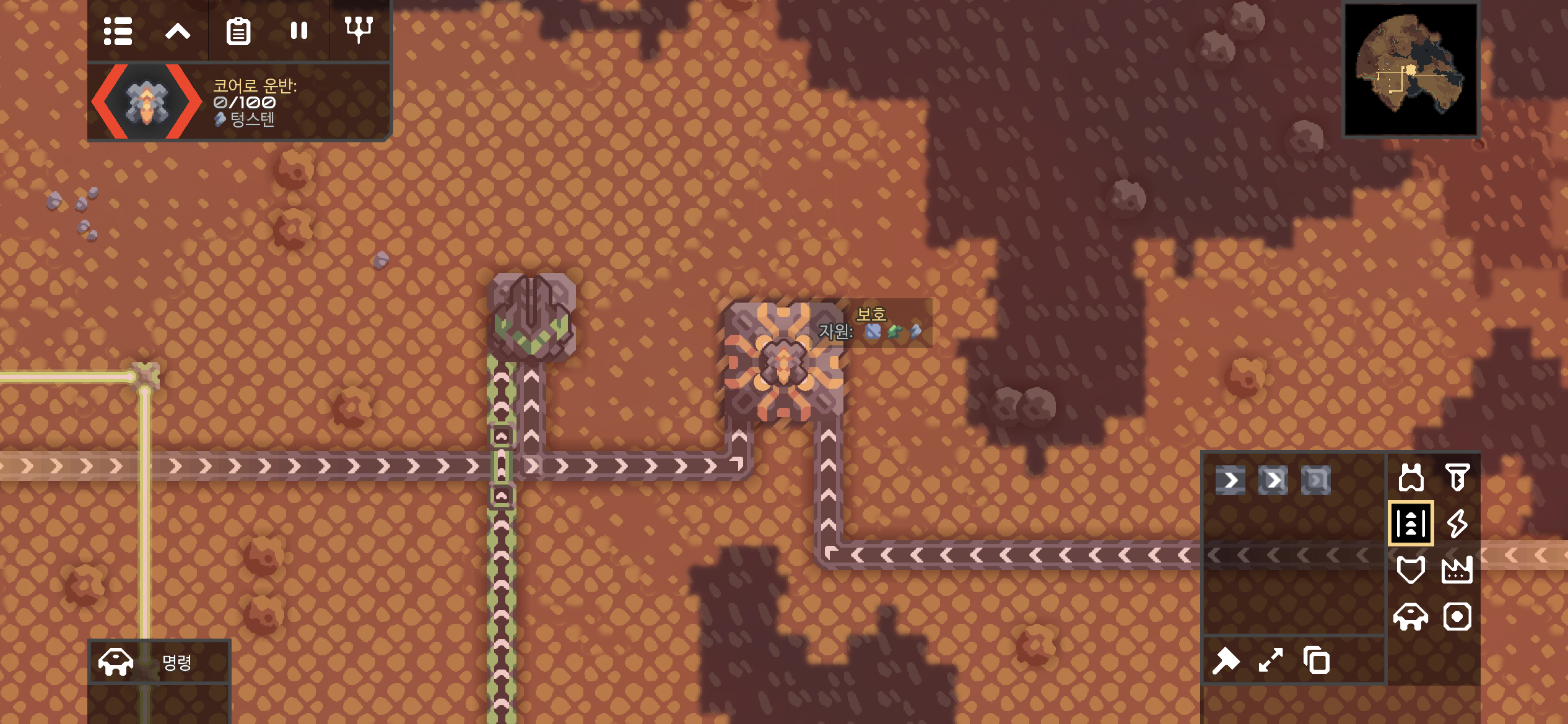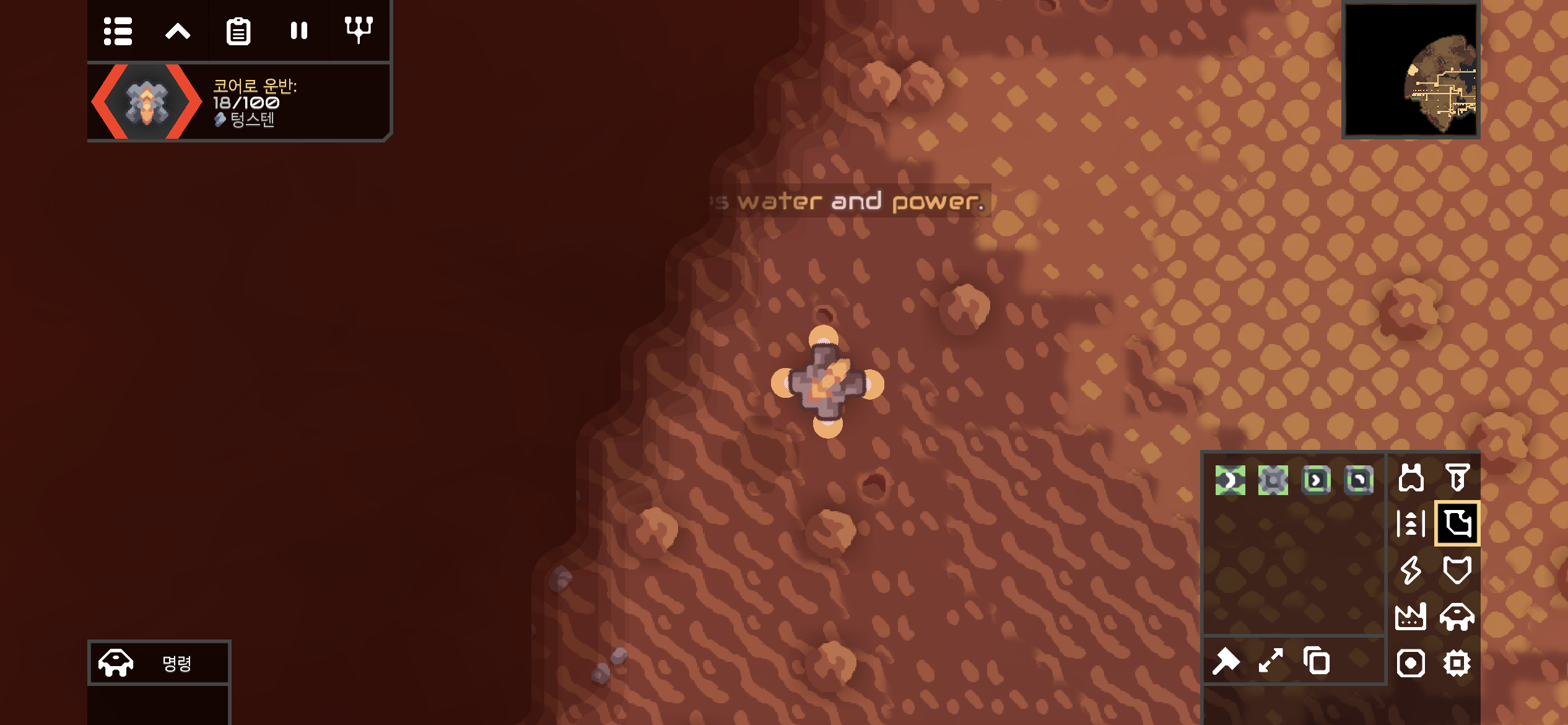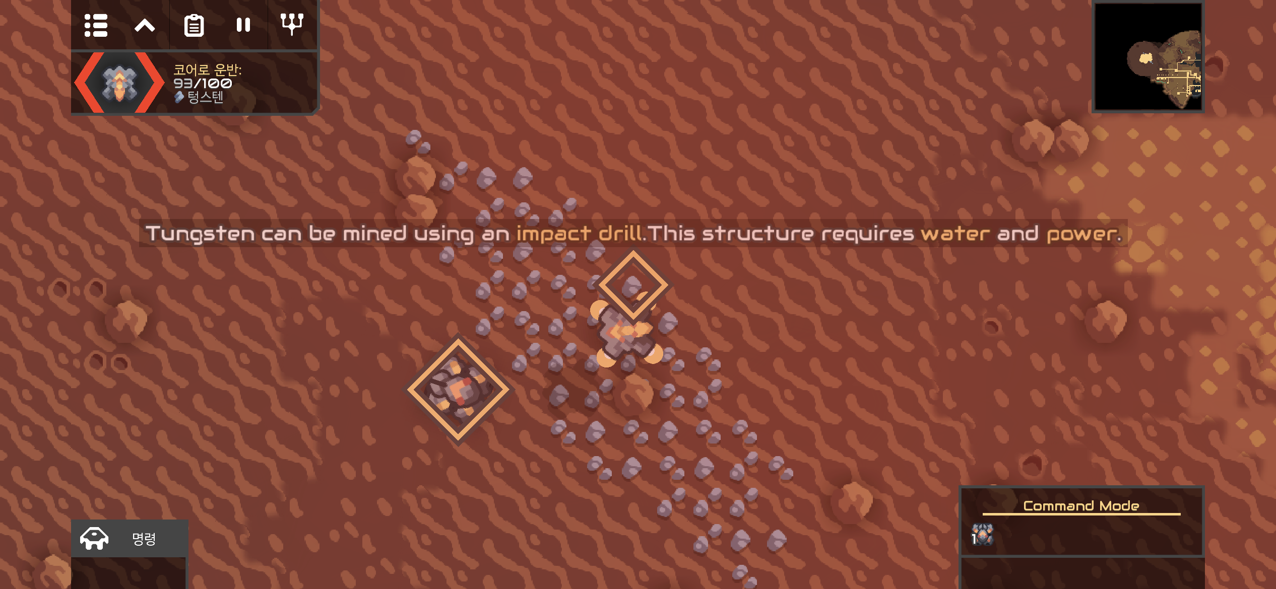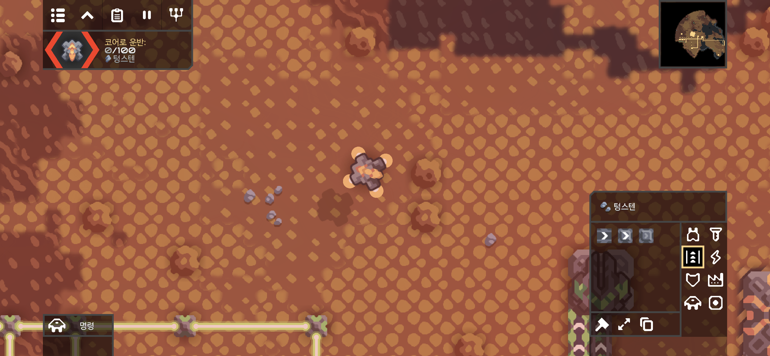 이 눈곱만 한 규모의 텅스텐을 100개나 채굴해 코어로 운반하라 합니다. 망할 튜토리얼! 그나저나 에르키아 행성에서는 벽 자원만 존재할 줄 알았는데 아니었네요.