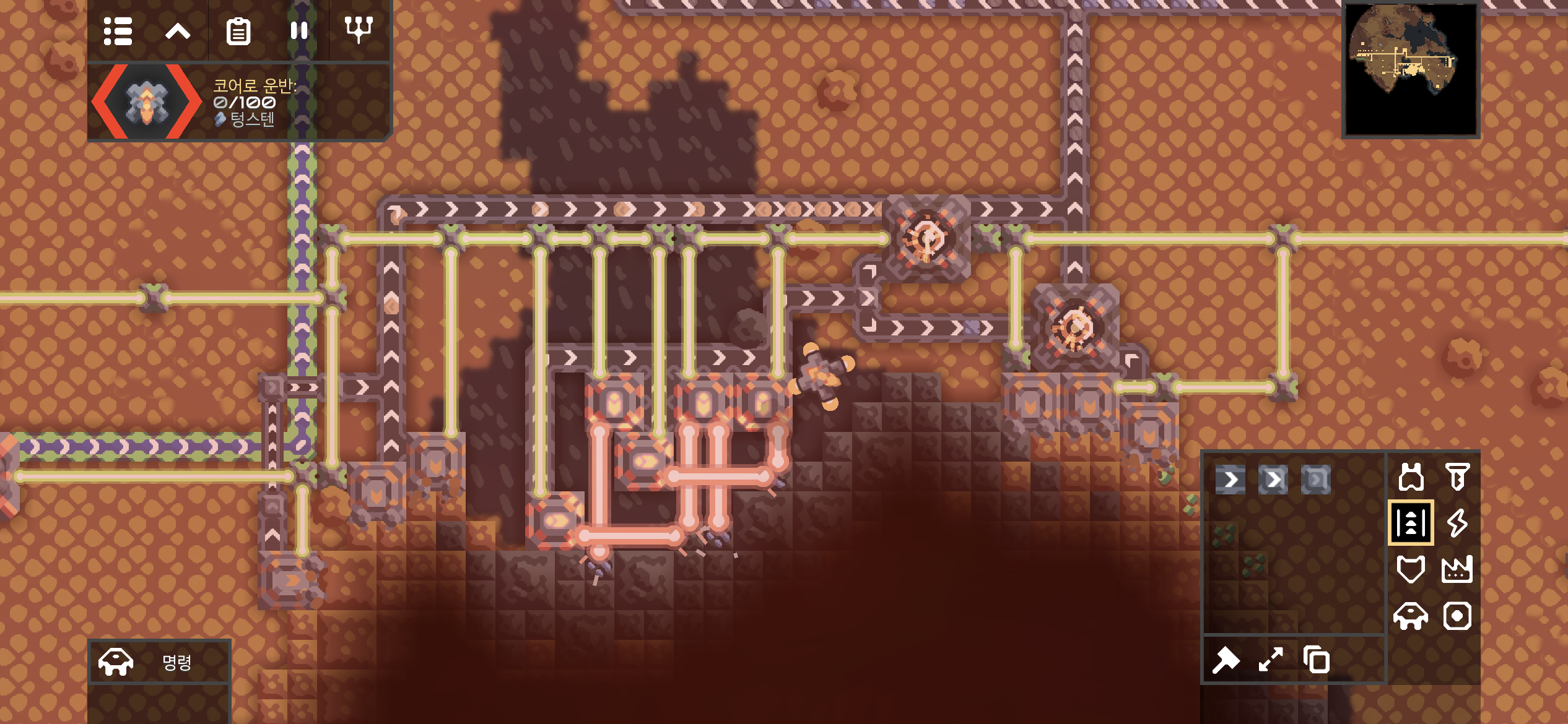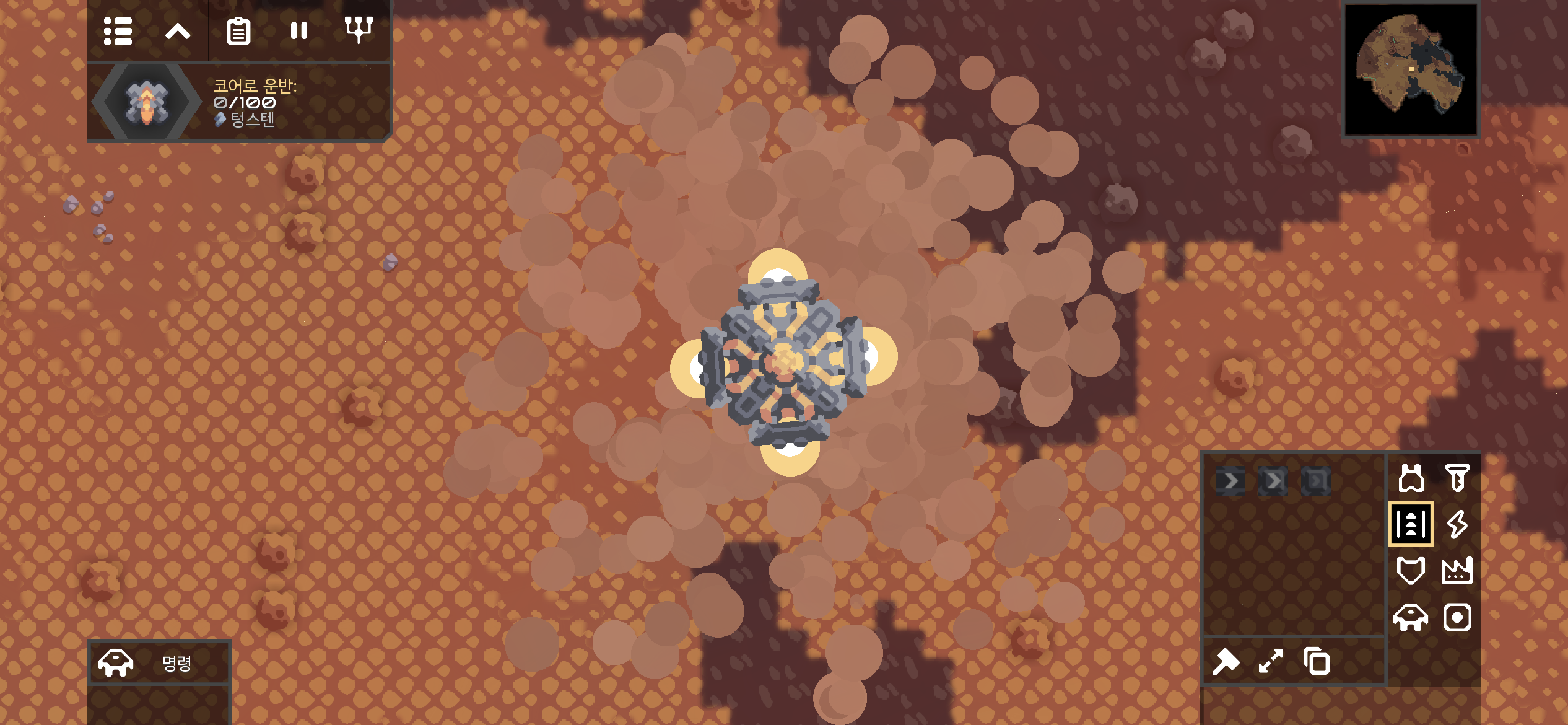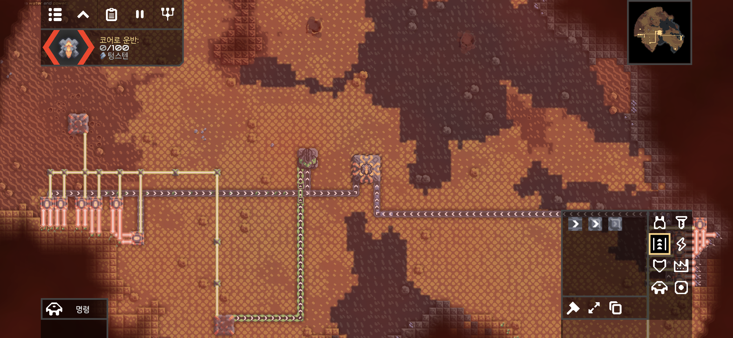이 눈곱만 한 규모의 텅스텐을 100개나 채굴해 코어로 운반하라 합니다. 망할 튜토리얼! 그나저나 에르키아 행성에서는 벽 자원만 존재할 줄 알았는데 아니었네요.