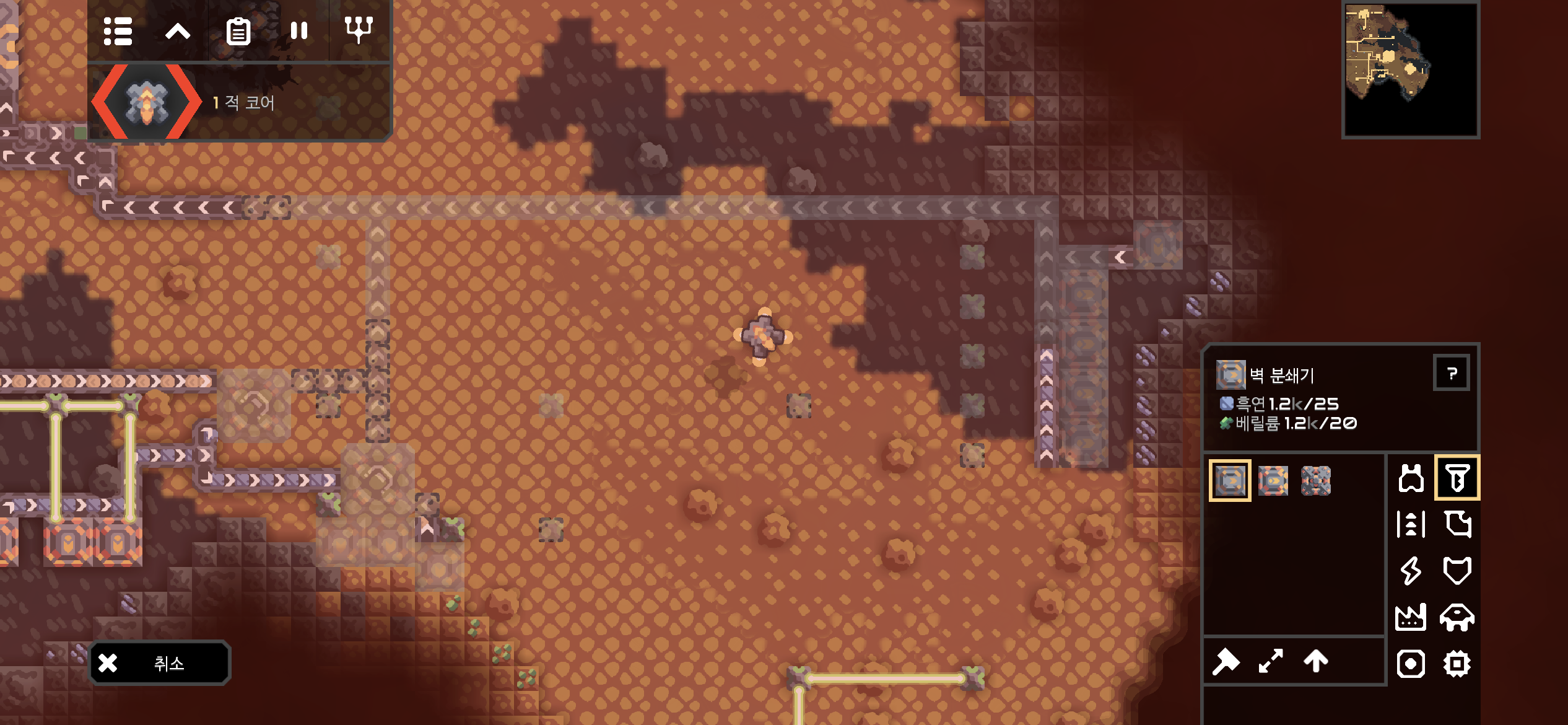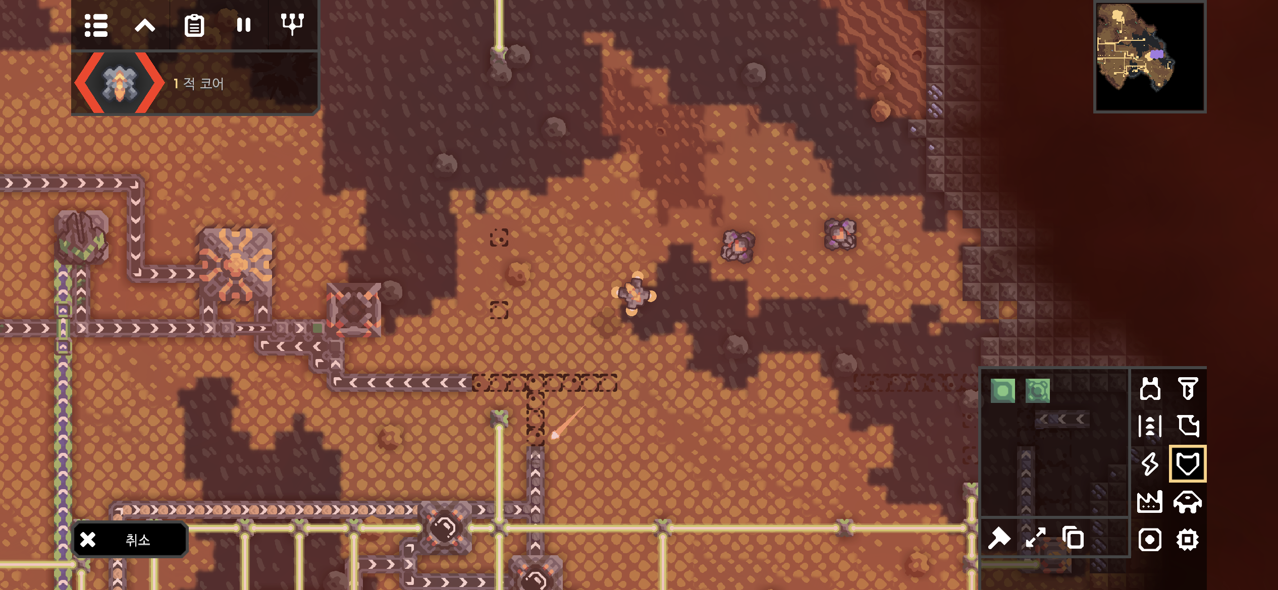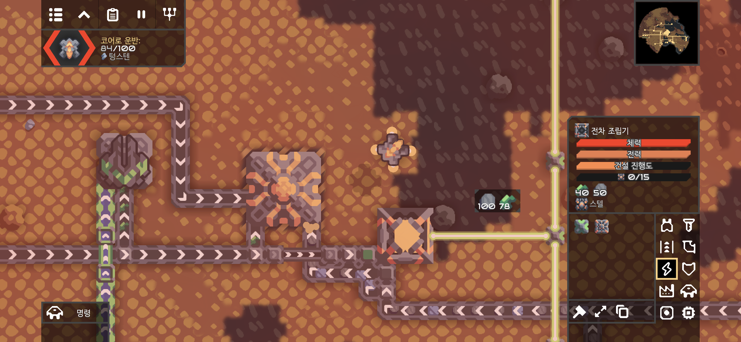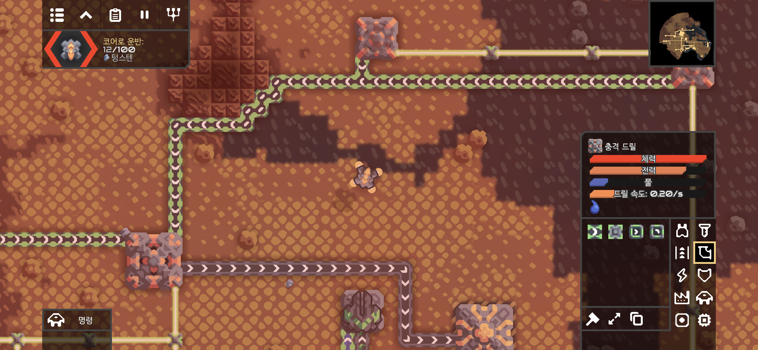 이 눈곱만 한 규모의 텅스텐을 100개나 채굴해 코어로 운반하라 합니다. 망할 튜토리얼! 그나저나 에르키아 행성에서는 벽 자원만 존재할 줄 알았는데 아니었네요.