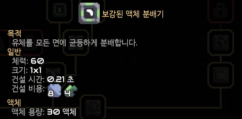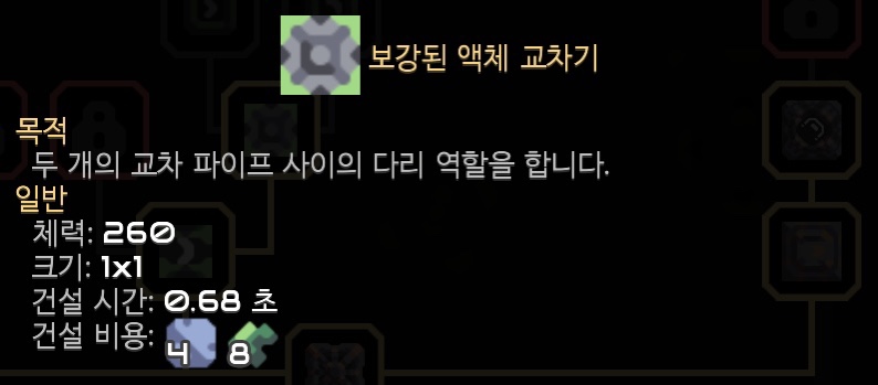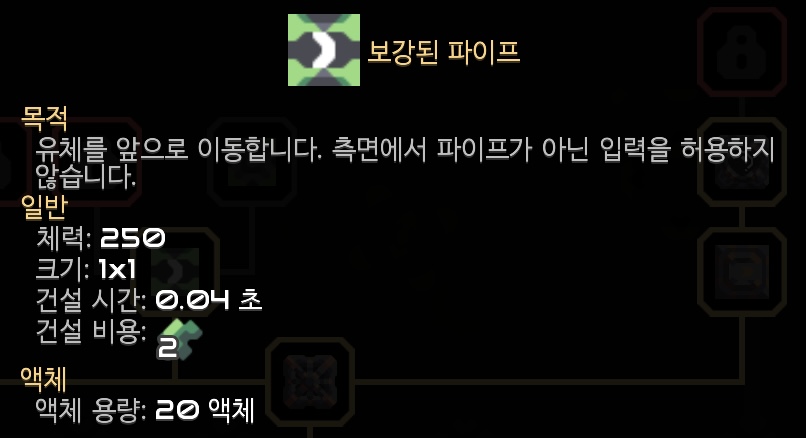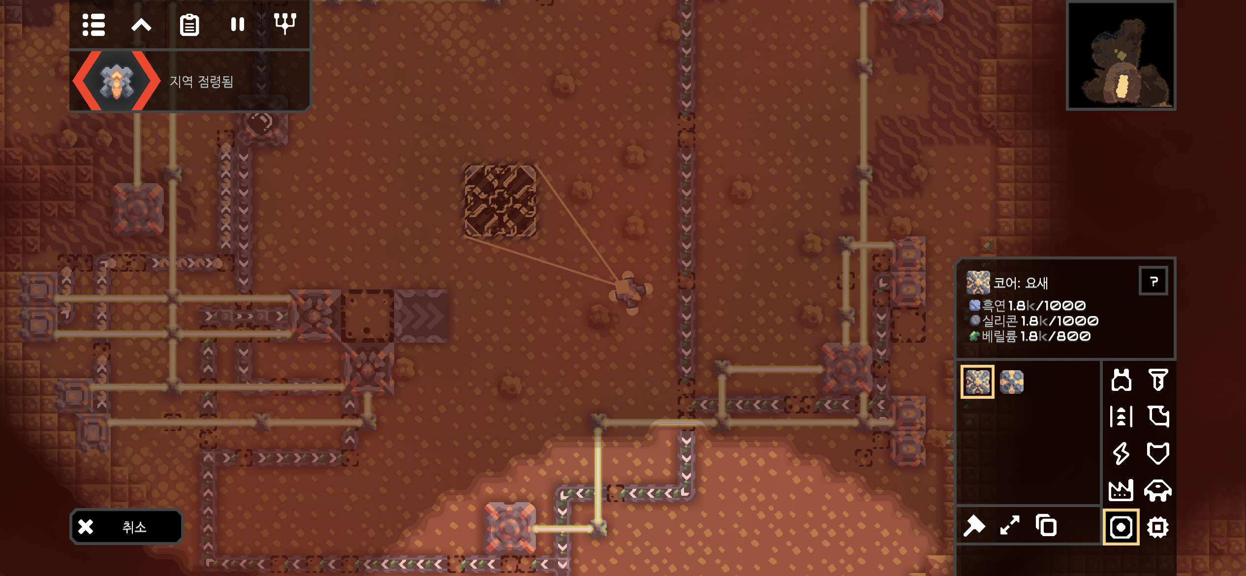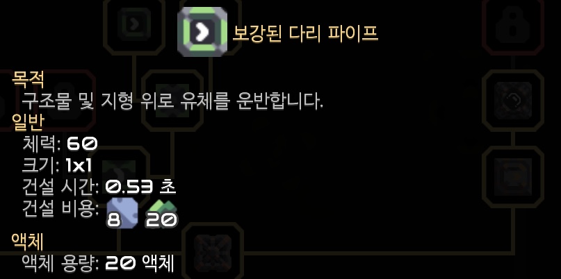 실리콘이 서서히 모이는 동안 해금된 연구들을 진행합니다. 세르플로 행성과 동일한 기능들을 하는 블록들이지만, 구분을 위해 ‘도관’이라는 명칭과 ‘보강된’이라는 명칭을 사용하는 것 같아요.