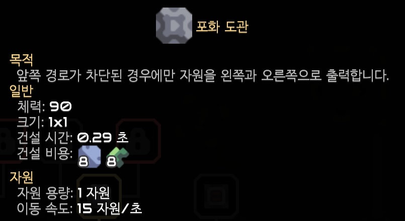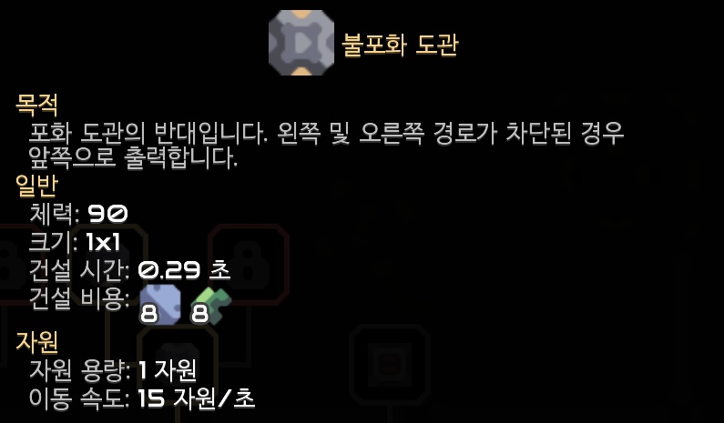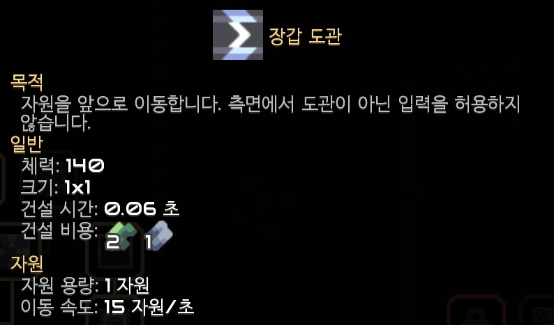장갑 도관은 세르플로 행성의 장갑 컨베이어와 동급으로 보이는데, 도관이 아닌 포화 도관이나 불포화 도관 또는 도관 분배기 등의 입력은 허용되지 않는다고 합니다.