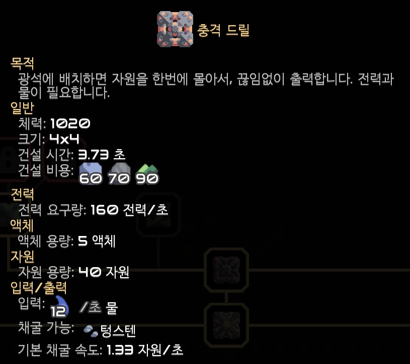 텅스텐을 채굴하기 위해선 충격 드릴을 사용해야 하며 물과 전력이 가동에 필요하다는 누구나 다 아는 힌트..