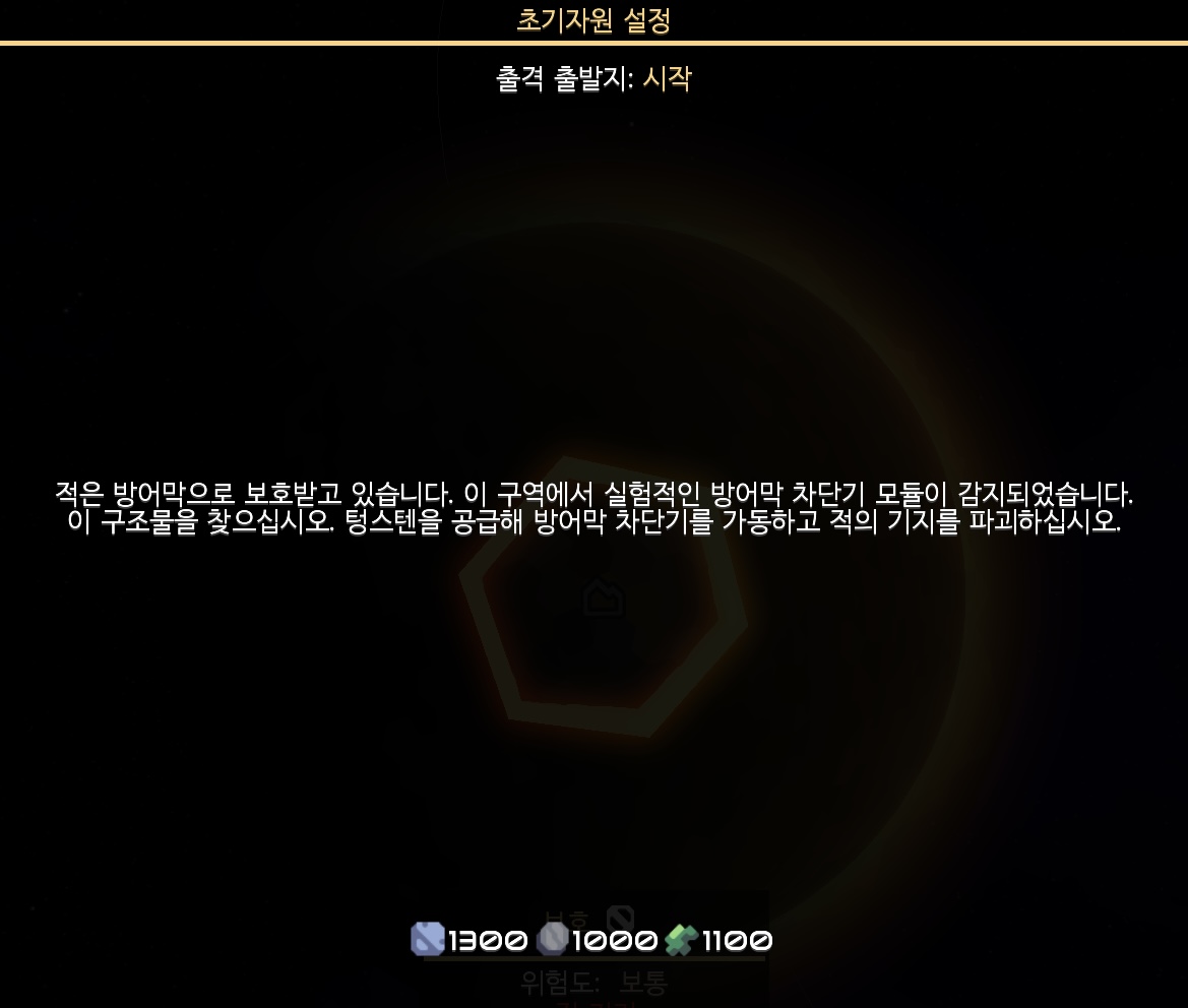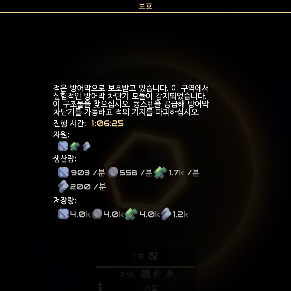 적은 방어막으로 보호받고 있습니다. 이 구역에서 실험적인 방어막 차단기 모듈이 감지되었습니다. 이 구조물을 찾으십시오. 텅스텐을 공급해 방어막 차단기를 가동하고 적의 기지를 파괴하십시오.