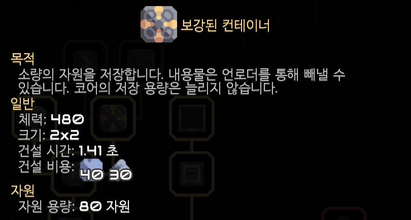 적 코어를 파괴하라는 튜토리얼에 따라 전차를 모으기로 합니다. 전차가 모이는 동안 연구를 진행했는데 에르키아 행성의 보강된 컨테이너는 용량이 80개로 굉장히 적어요. 또한 코어에 붙여 짓는다 해도 용량을 늘릴 수 없습니다. 언로더 도관 또한 코어의 자원을 빼낼 수 없는 작은 차이가 있습니다.