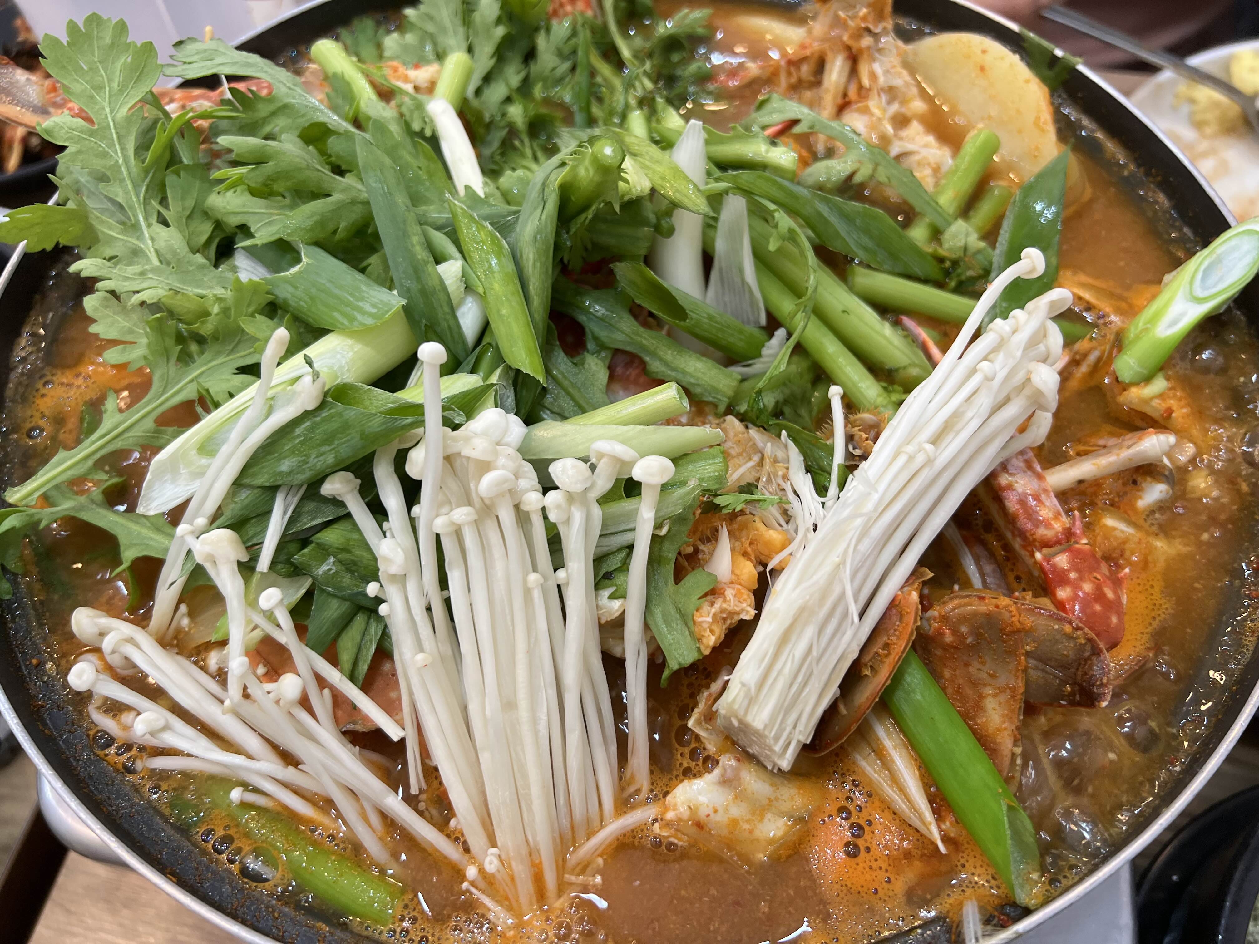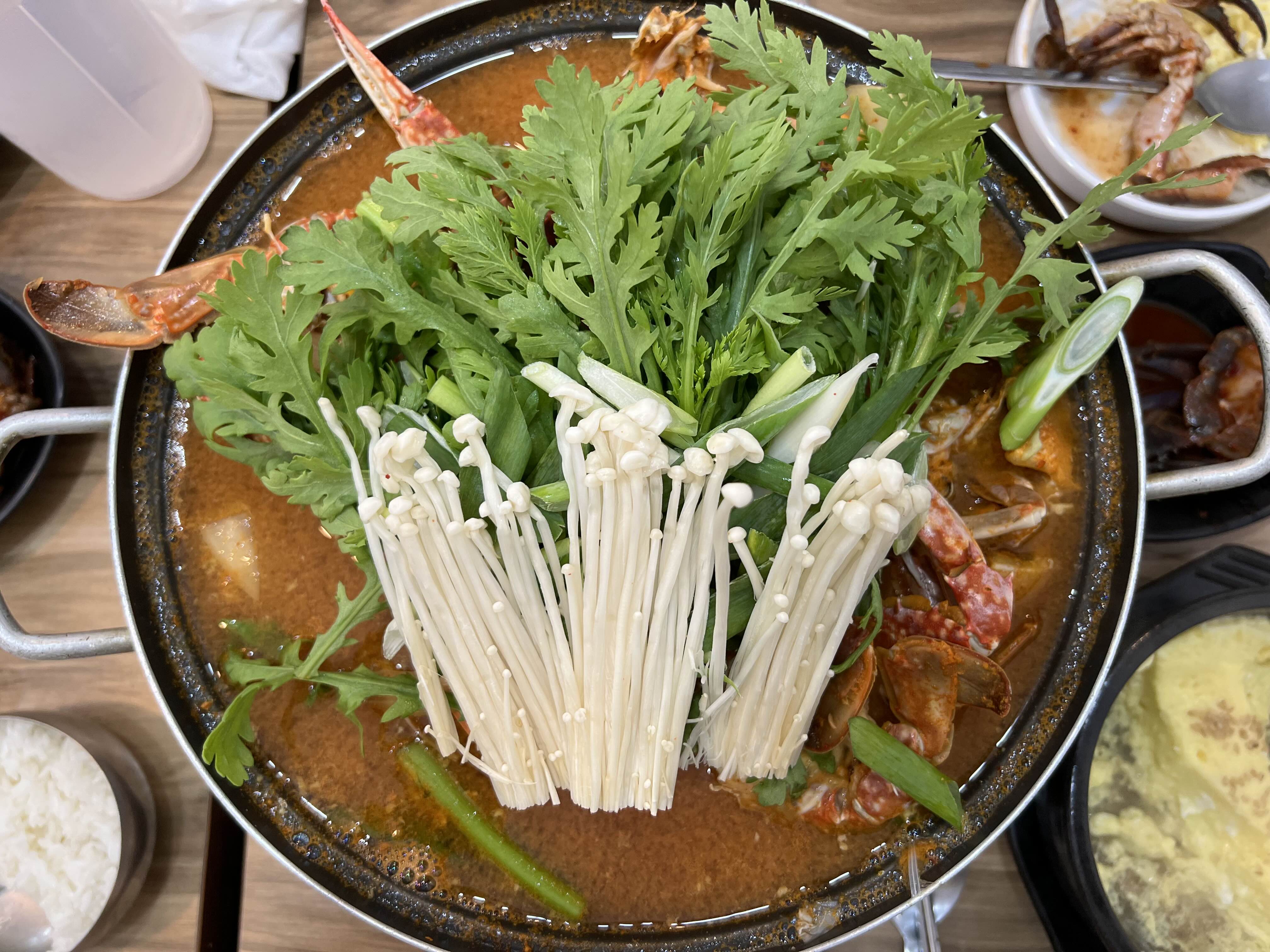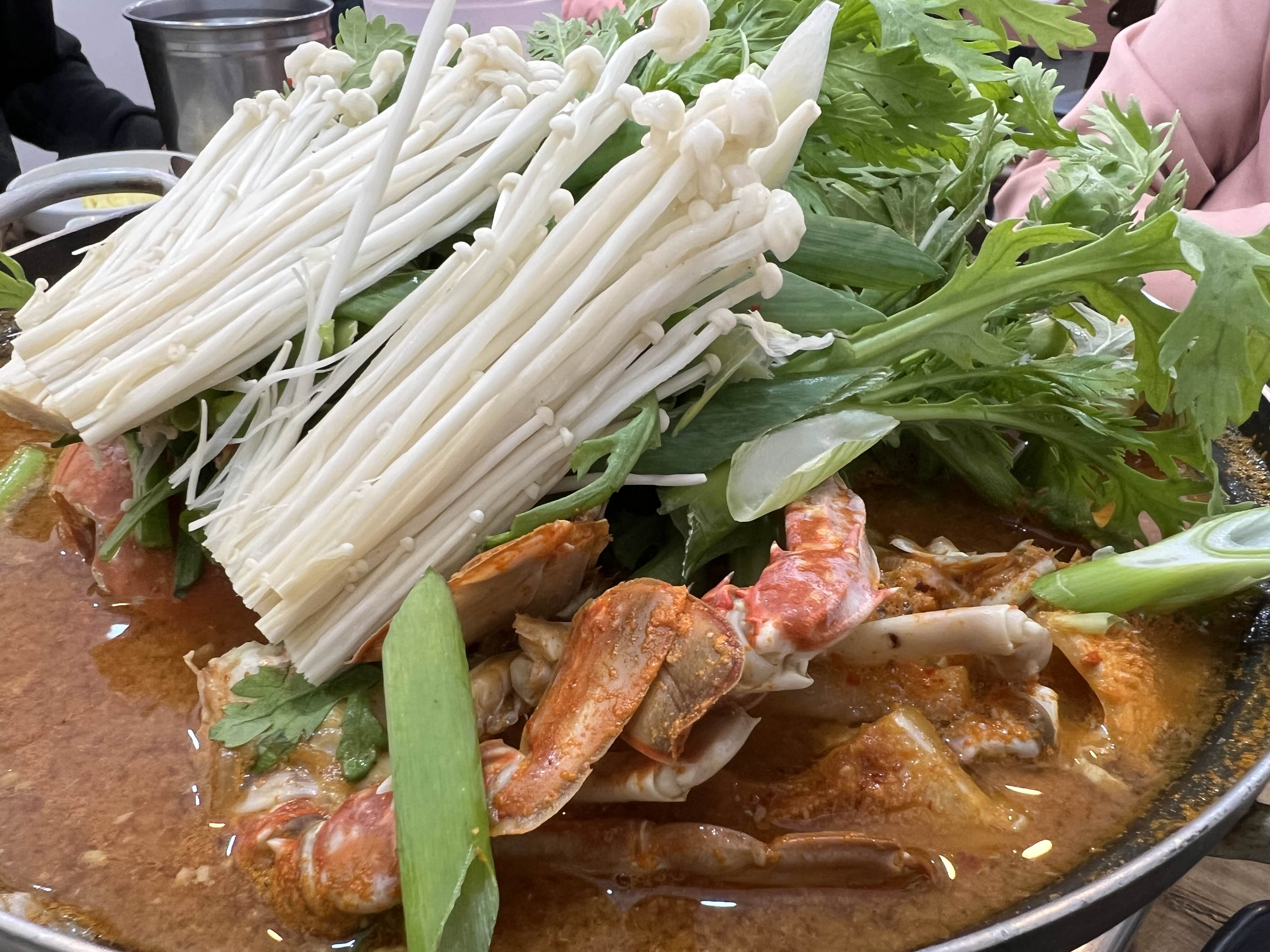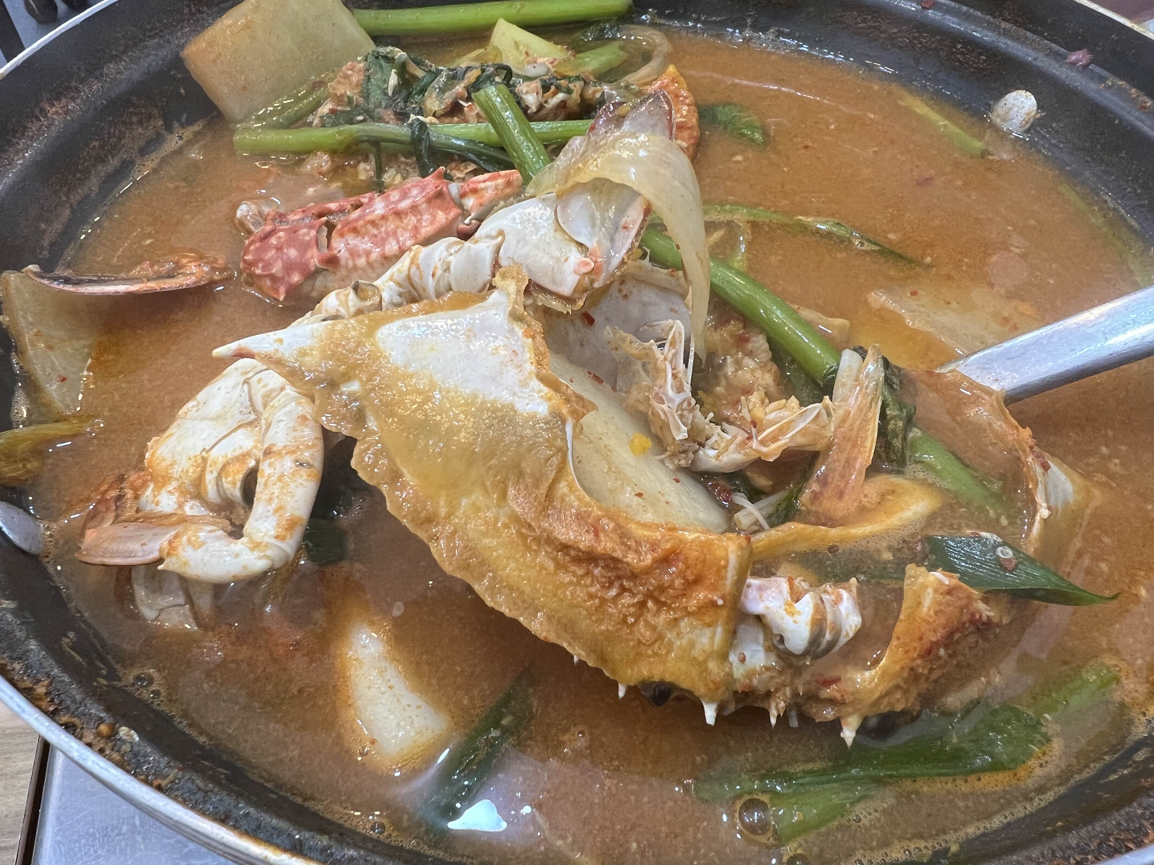 꽃게탕.. 말이 필요 없지요. 미나리 철이 아니라 미나리 대신 쑥갓이 들어간 꽃게탕입니다. 꽃게철이었다면 서해에서 갓 잡아 올린 싱싱한 꽃게를 맛볼 수 있었겠지만 꽃게가 지금은 철이 아니라 냉동 꽃게인 게 조금은 아쉬웠습니다. 그렇지만 게가 아주 크고 실합니다. 냉동 꽃게만의 매력이 있죠.