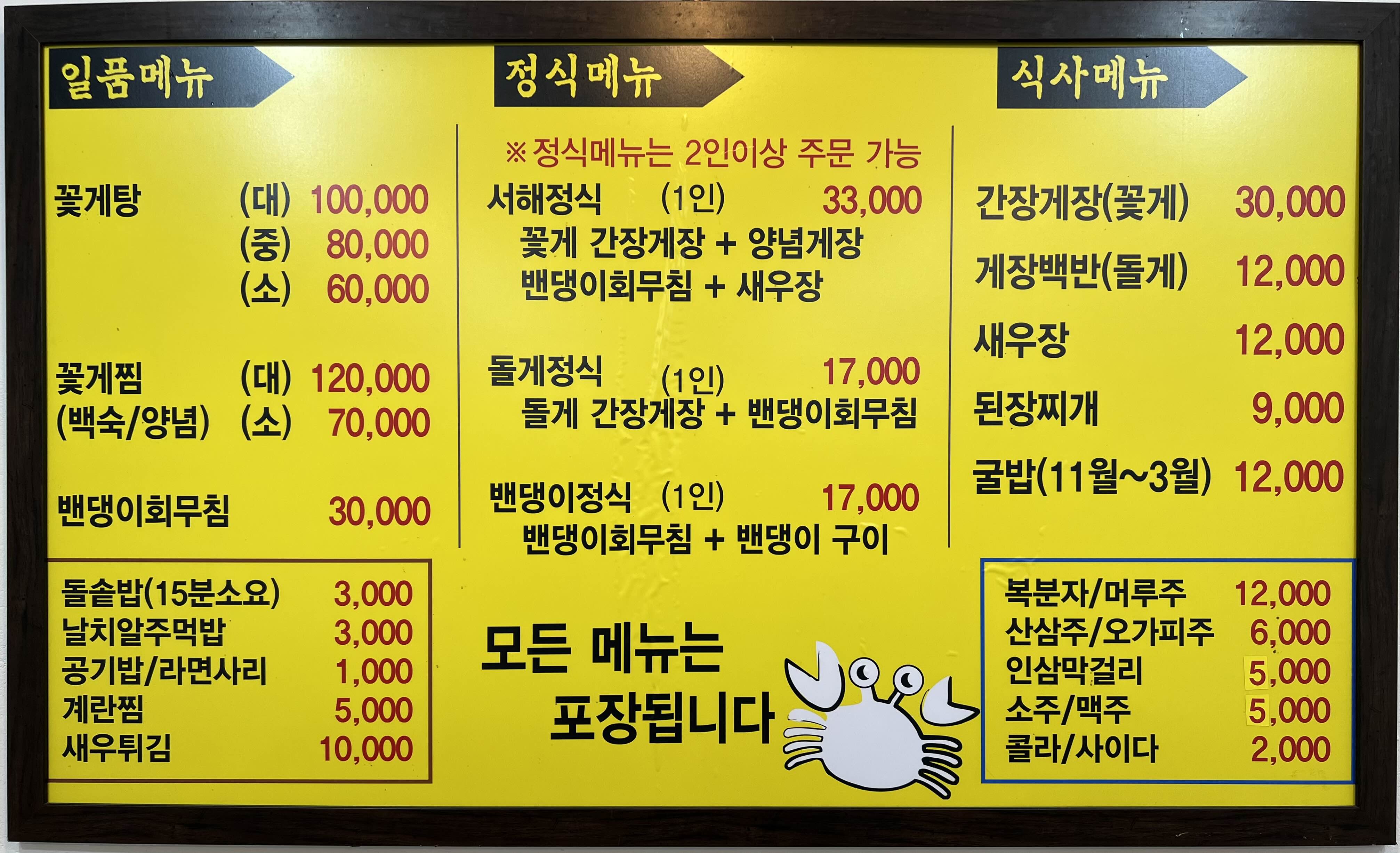 서해 꽃게 전문 메뉴판. 게를 전문으로 요리하는 식당이라 그런지 메뉴가 온통 게판이네요! 크크