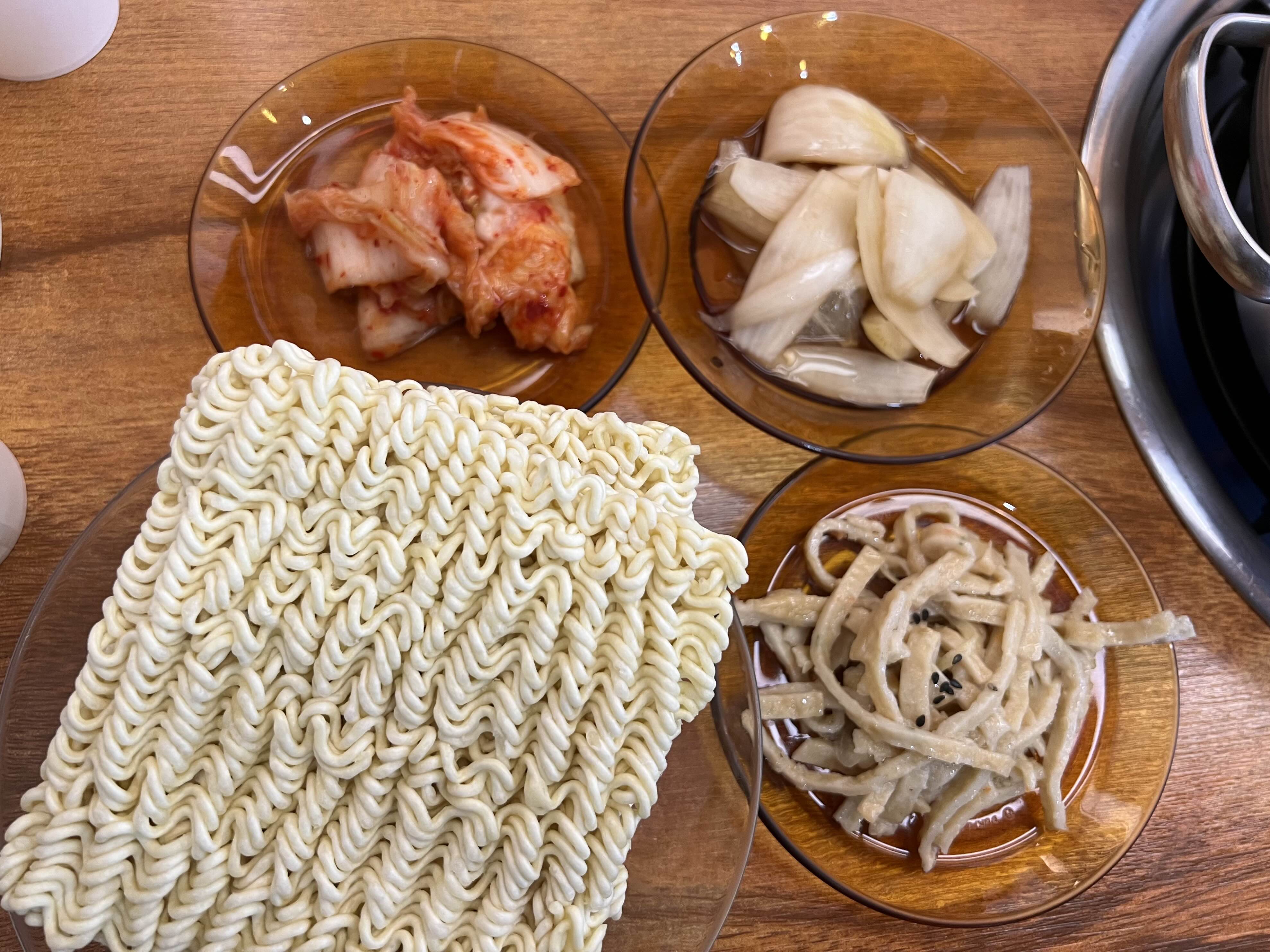 테두리 햄은 벌써 동이 났습니다! 역시 네 명의 성인 남성 앞에선 어떤 음식이던 순식간에 사라집니다. 라면 사리를 투하하고 면이 익을 때까지 보이는 햄들을 냠냠하며 잠시 동안 배고픔을 달래며 기다립니다.