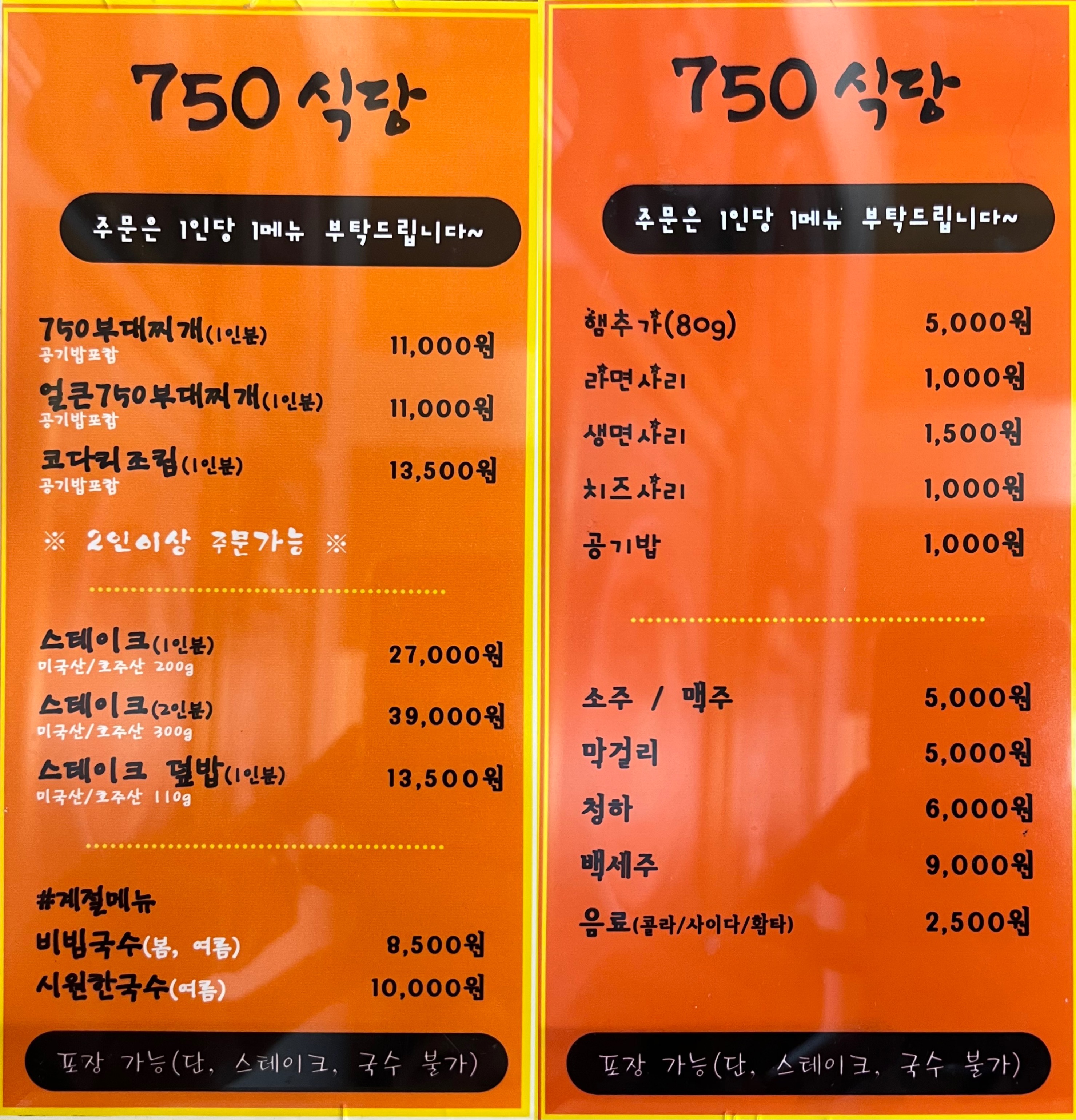 직장인 대부분은 매일 점심시간마다 행복한? 고민을 합니다. 오늘도 점심을 고민하던 네 명의 직장인은 서울 강동구 길동사거리에 있는 “750 부대찌개 스테이크”를 가보기로 뜻을 모아 방문했습니다.