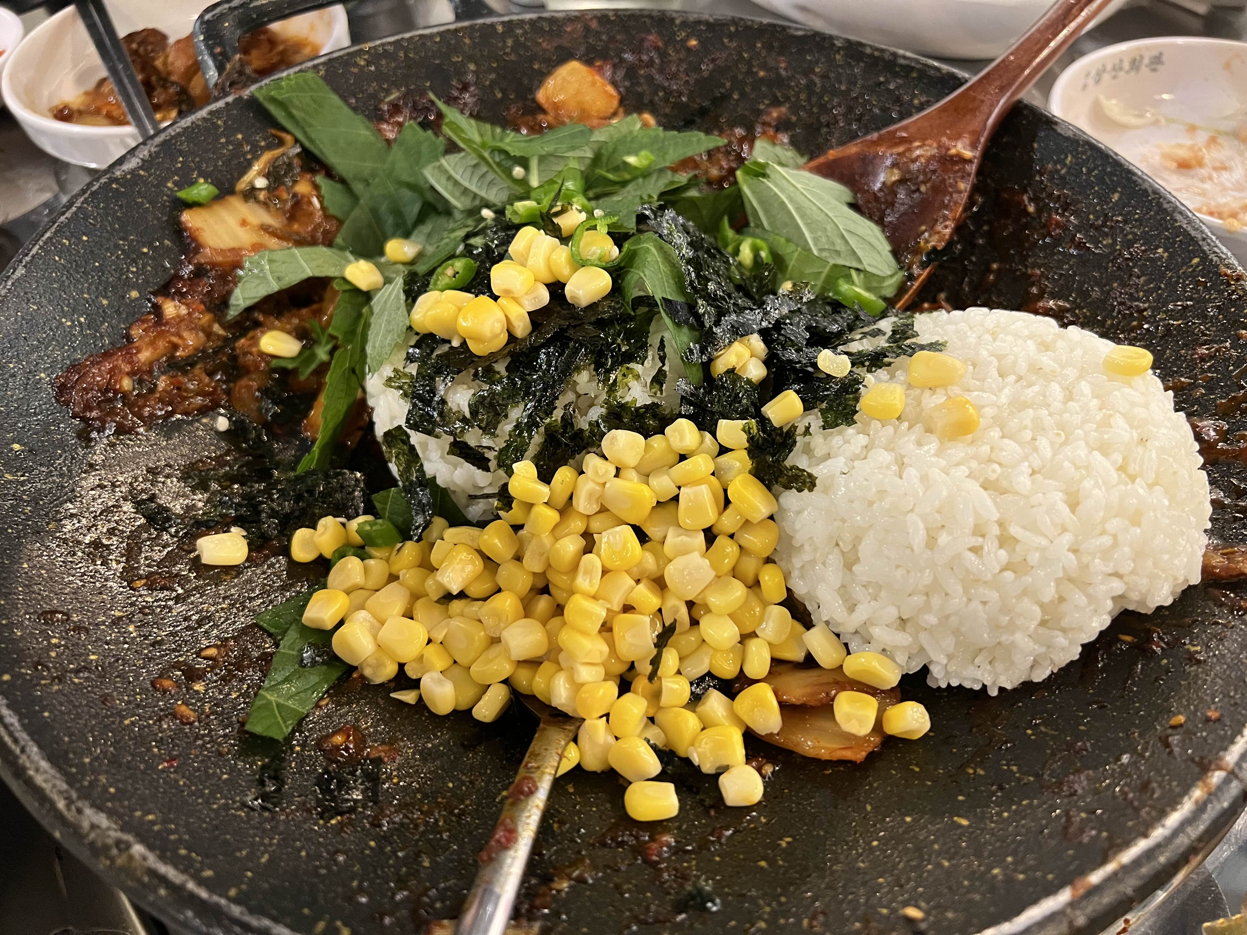 고기를 금세 먹어치우고 공깃밥 두 개를 주문합니다. 공깃밥과 볶음 재료는 직원분이 투하를 해주시나, 볶음밥을 요리하는 건 셀프입니다.