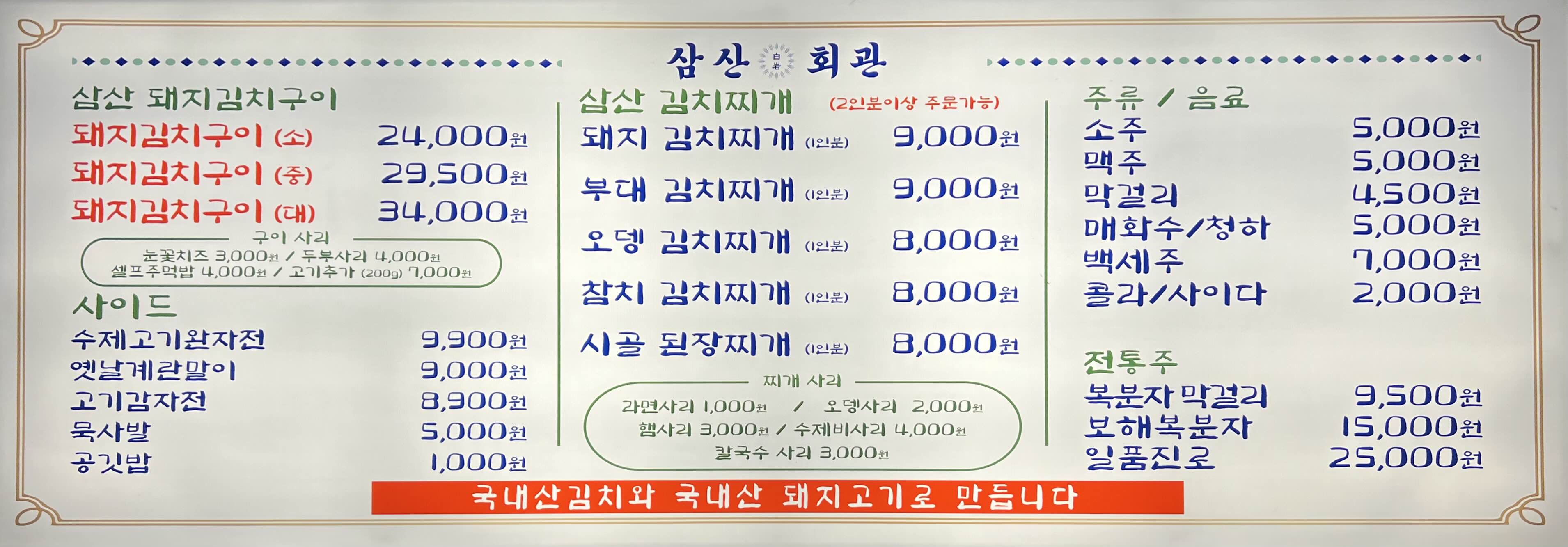 삼산회관 메뉴판! 메인 메뉴인 삼산 돼지김치구이는 빨간 글씨로 강조되어 있습니다. 국내산 김치와 국내산 돼지고기로 만든다는 돼지김치구이가 가격도 착합니다.