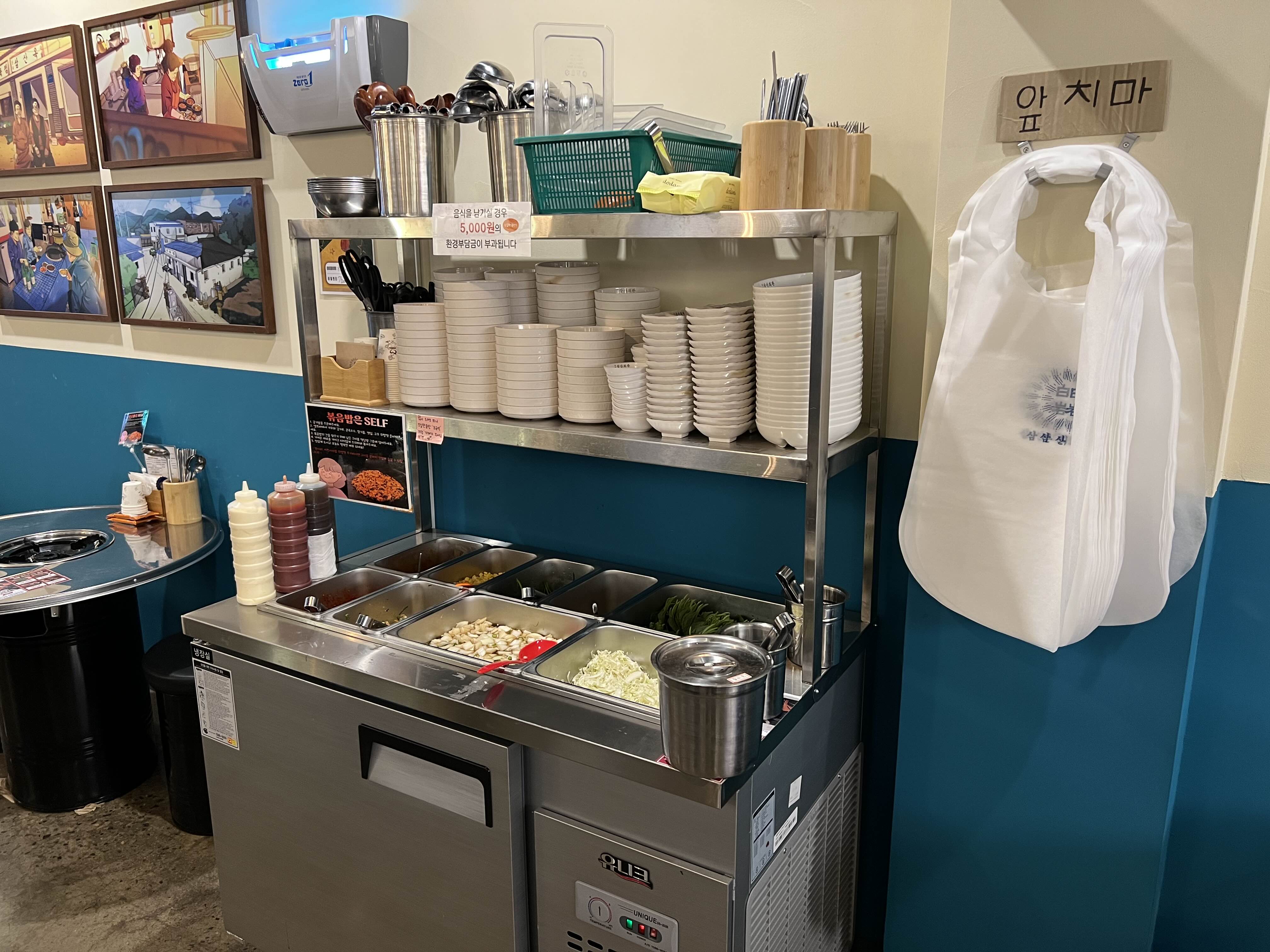 셀프바와 앞치마가 깔끔, 가지런하게 정리되어 있네요.