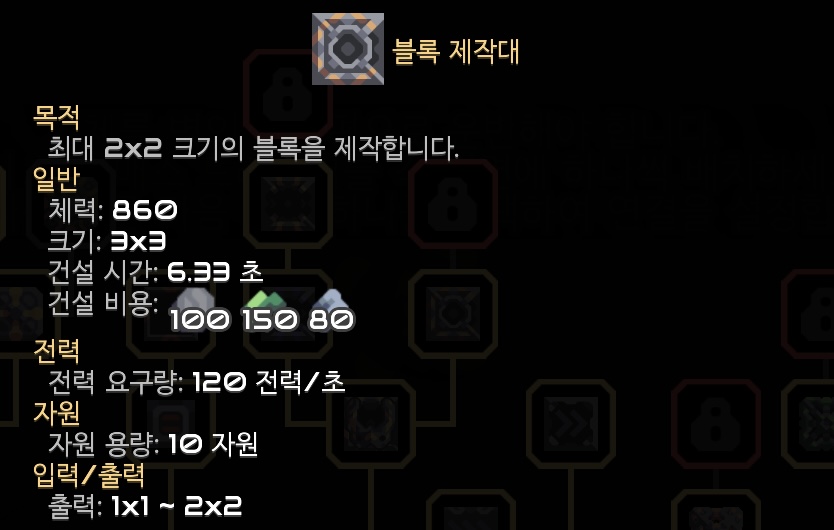 블록 제작대는 2x2 크기 이하의 블록을 제작합니다. 제작된 블록을 화물 매스 드라이버로 날릴 수 있습니다만, 아직은 블록 제작대가 어떻게 활용되는지는 알 수가 없네요.