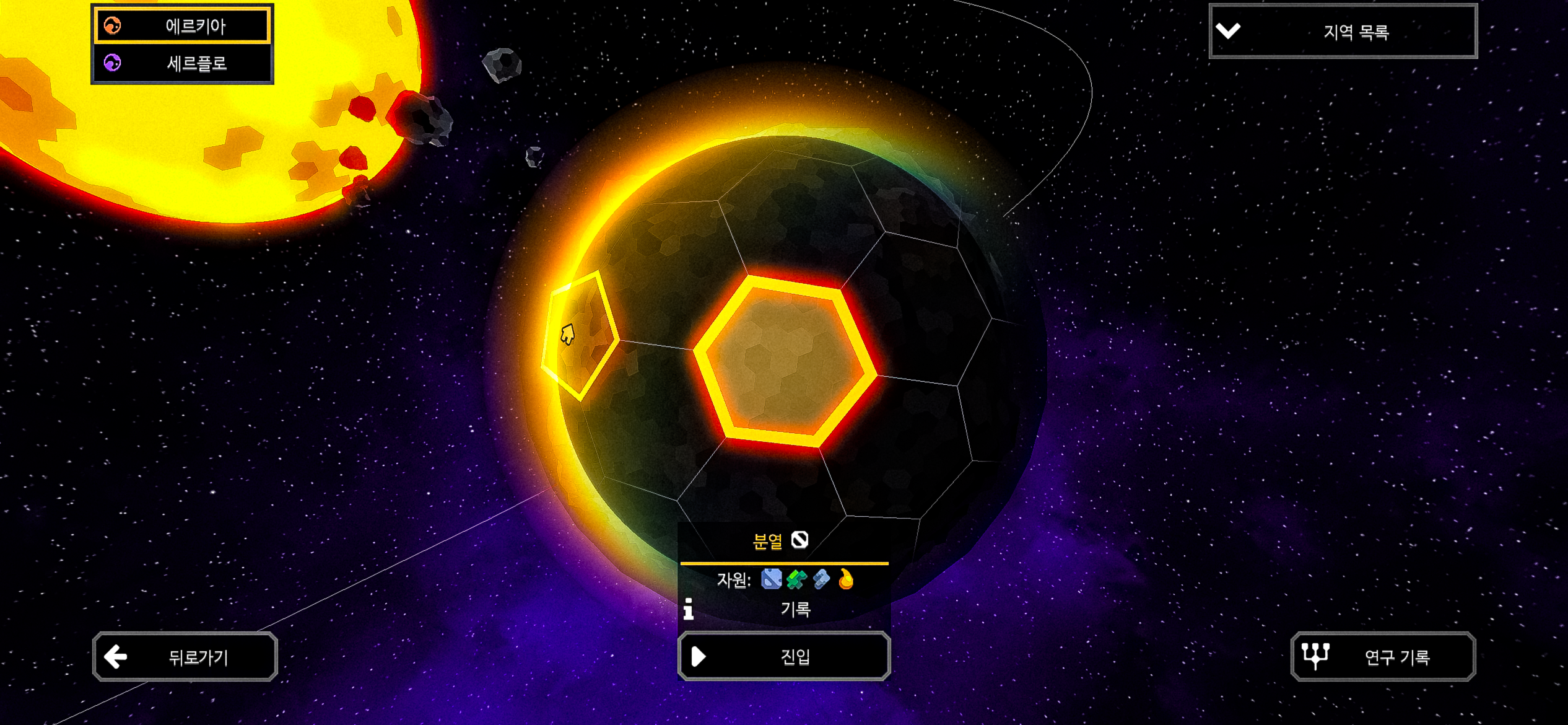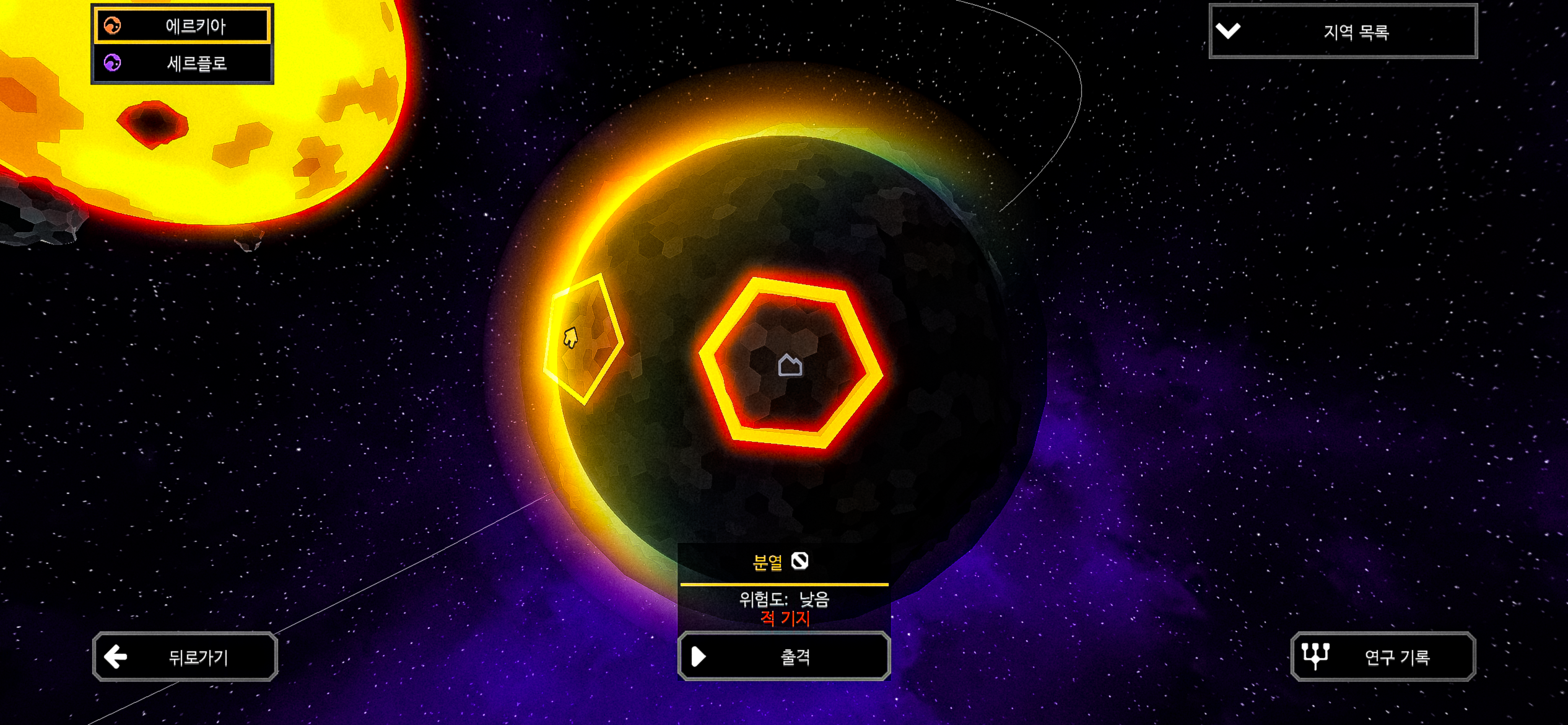 에르키아 행성의 다섯 번째 네임드 섹터인 아틀라스까지의 점령을 마치고 벌써 여섯 번째 네임드 섹터, 분열의 차례입니다. 적 기지 섹터인데.. 띠용? 위험도가 낮음이네요. 이전 섹터인 높음 위험도의 아틀라스보다 오히려 낮아진 위험도입니다.