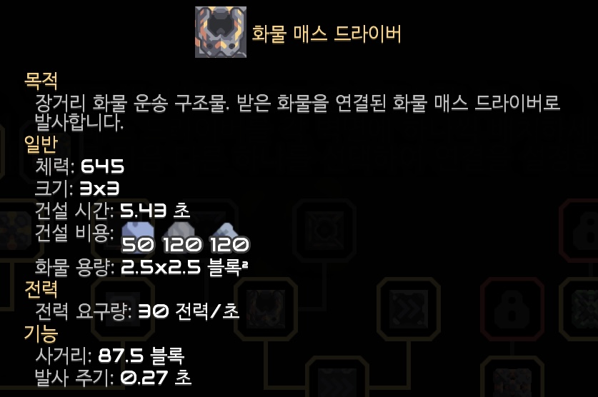 섹터에 도착하며 해금되어 연구한 화물 매스 드라이버는 2.5x2.5 크기 이하의 블록은 건물 유닛 상관없이 전송이 가능합니다. 사거리가 무려 87.5블록인데 전력 요구량이 30!! 세르플로의 매스 드라이버(사거리 55, 전력 요구량 105)에 비해 활용성이 상당히 높아 보입니다.