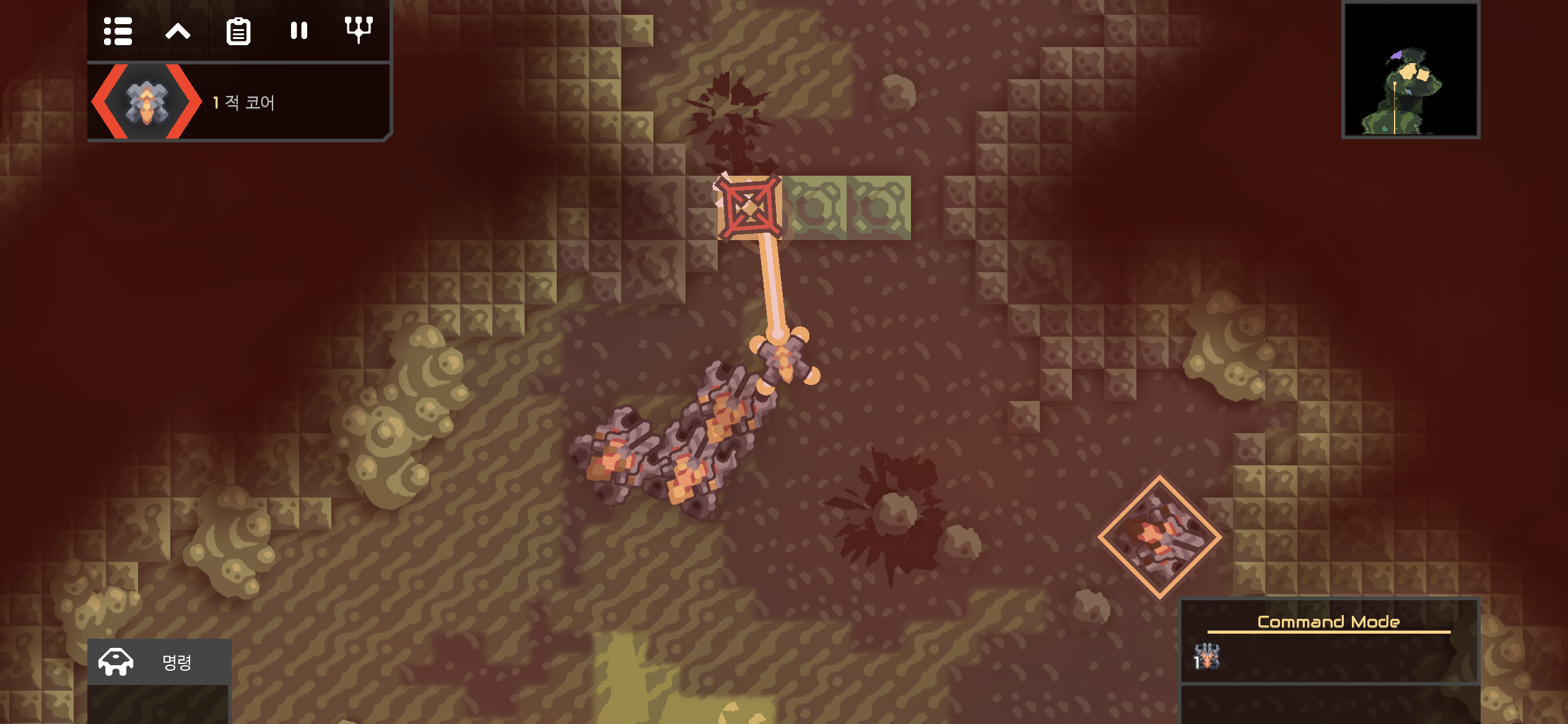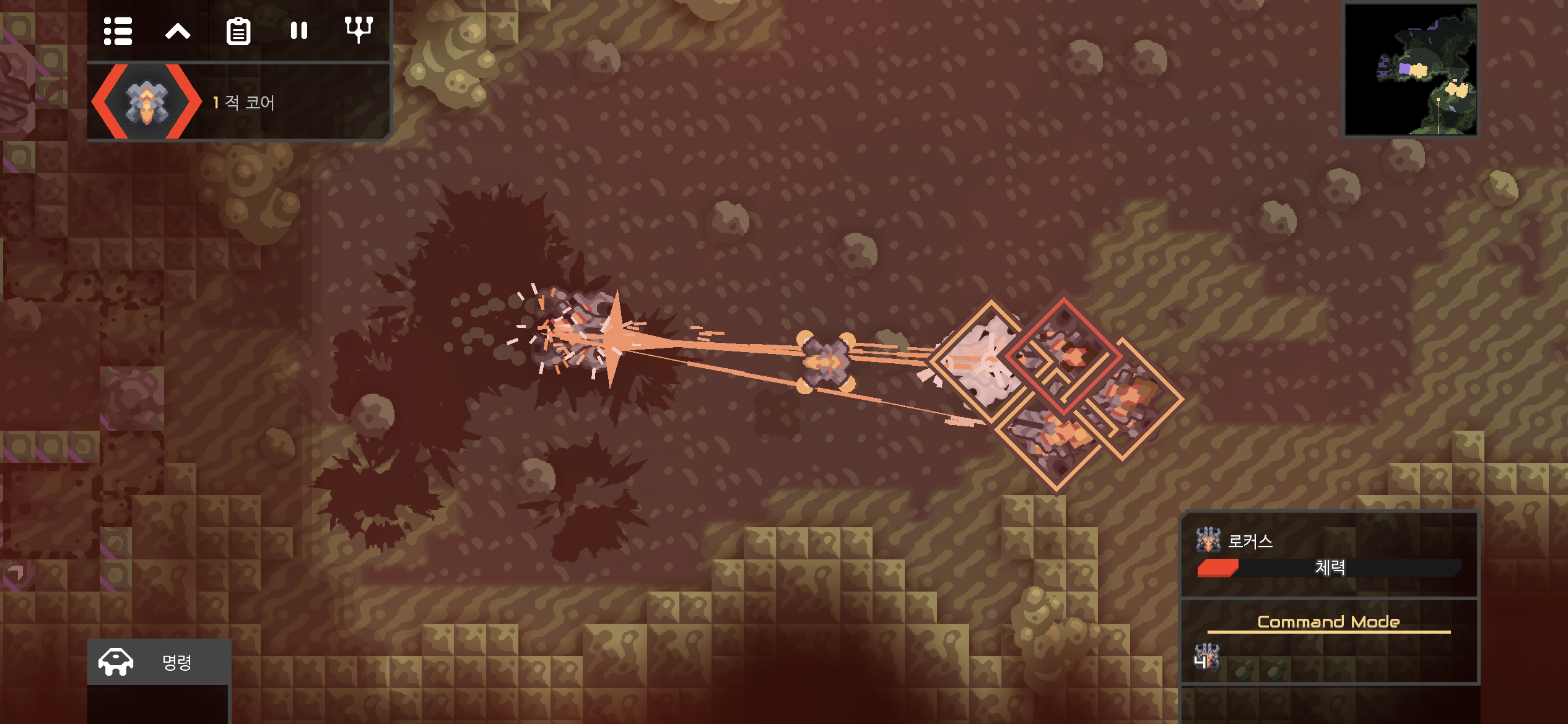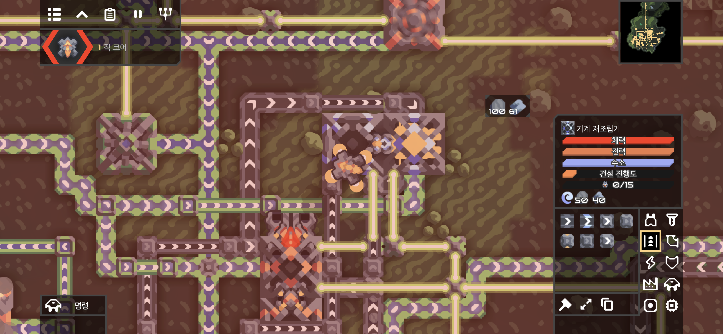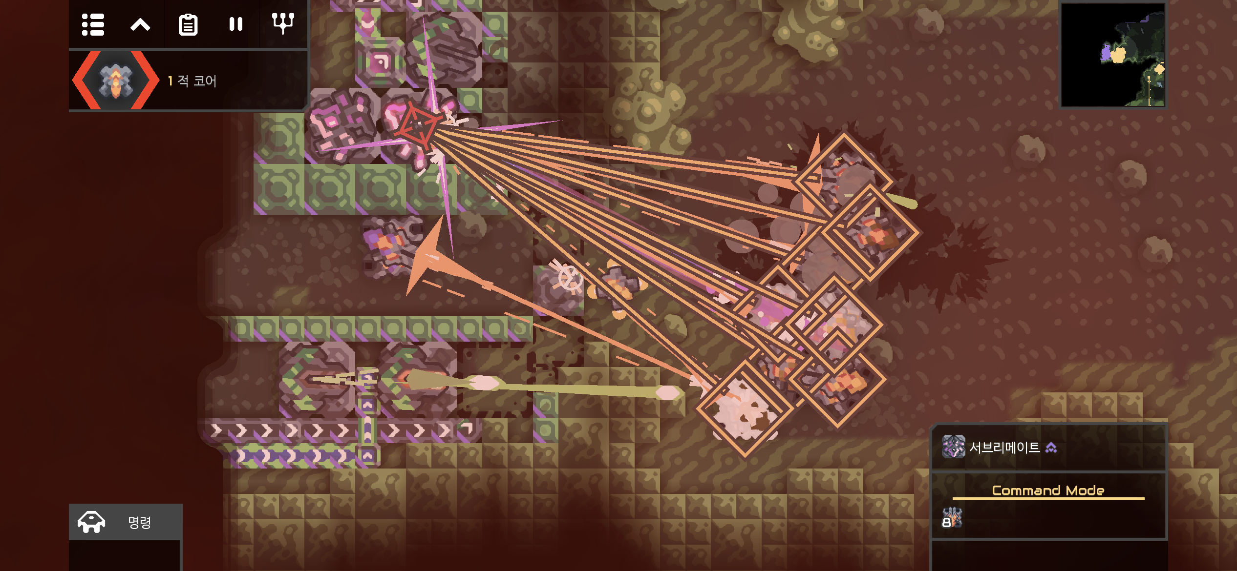 나도 한번 서브리메이트를 만들어볼까? 하다가 핑크 레이저 공격은 적에게 당한 것에 만족하기로 합니다. 그리고 습지는 적 기지 맵이니 방어가 아닌 적 코어를 파괴하는 게 우선시 되어야 합니다.