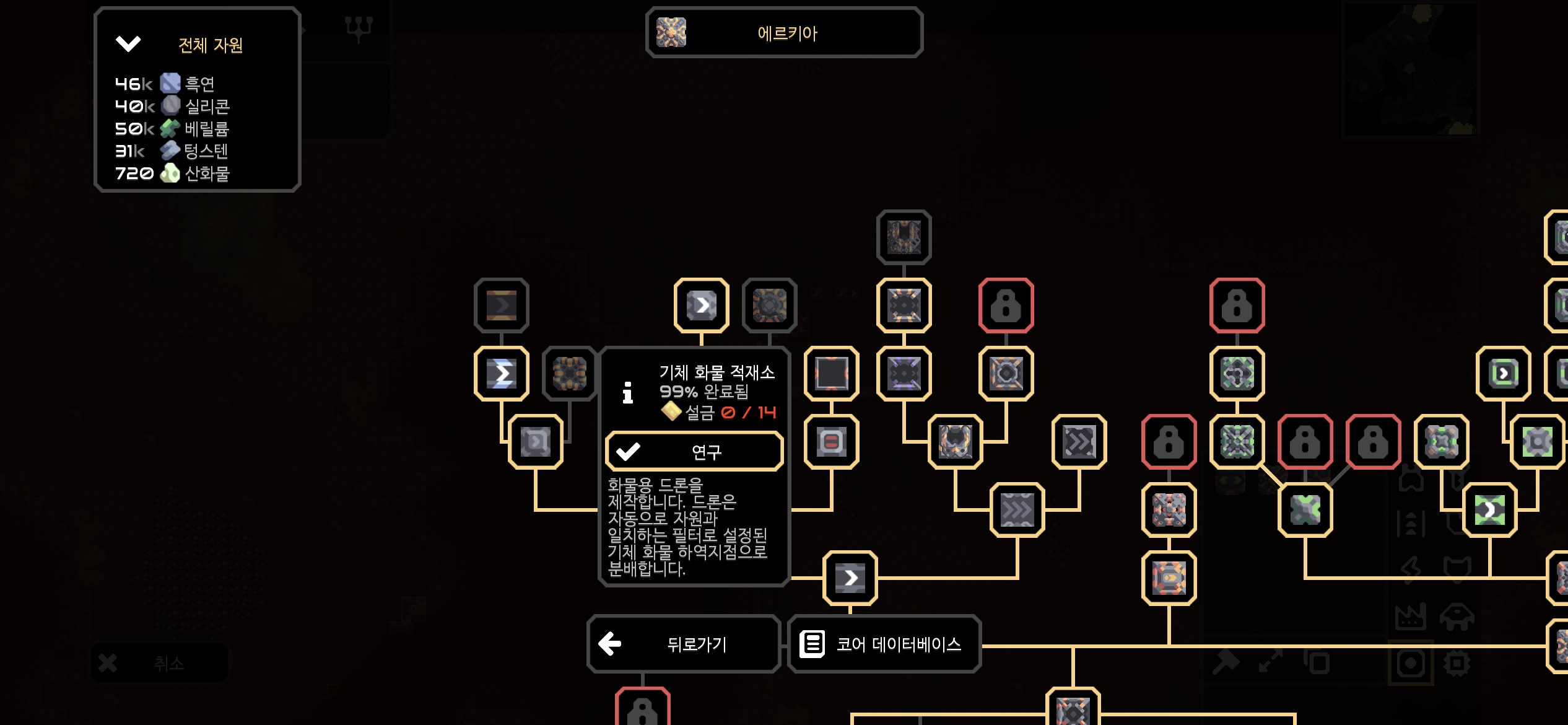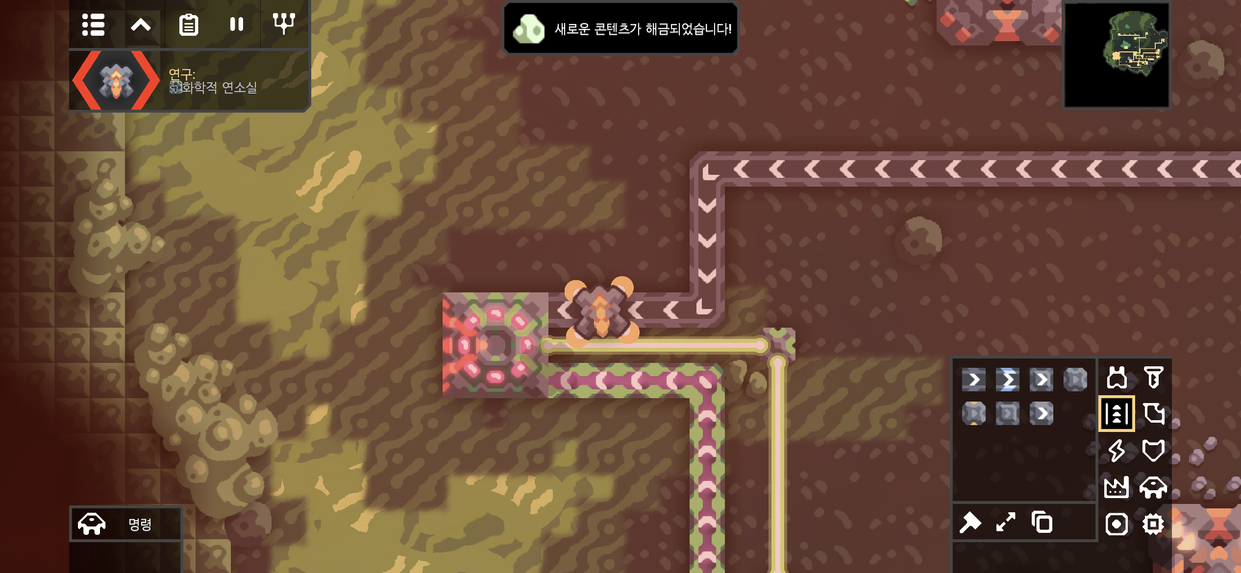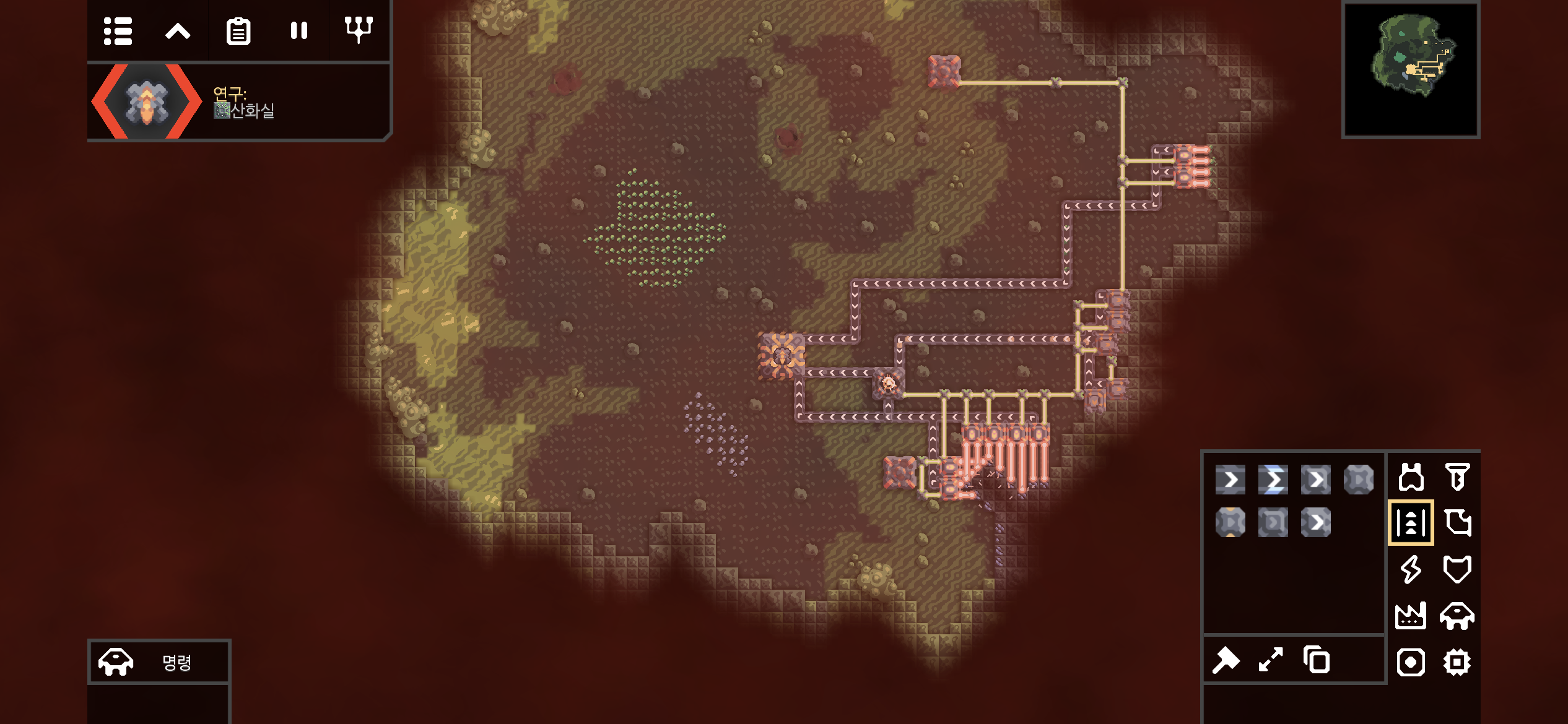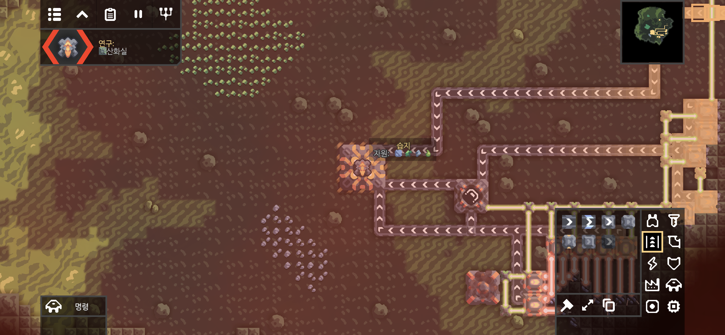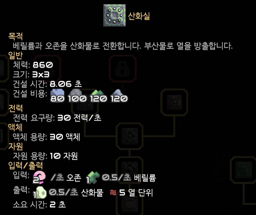 습지에 진입하며 해금된 산화실입니다. 산화실은 오존과 베릴륨을 재료로 산화물을 만드는데, 산화물과 함께 열을 방출하는 것으로 보아 열을 이용하는 시설이 추후 해금될 듯합니다. 새로운 건물이 해금되면 연구를 진행하고 바로 지어봐야겠죠! (뚝딱뚝딱)