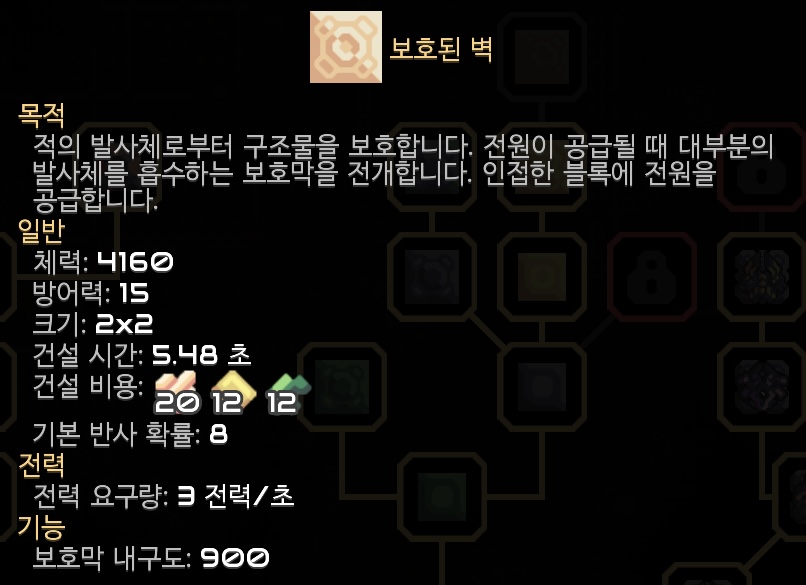 세르플로 행성의 메타 벽처럼 생긴 보호된 벽은, 해금은 됐으나 메타가 없어 연구하지 못했습니다. 전력이 필요한 방어 벽이며, 900만큼의 발사체를 흡수하는 보호막 기능이 있다고 합니다. 인접한 블록에 전원을 공급하는 기능도 있네요.