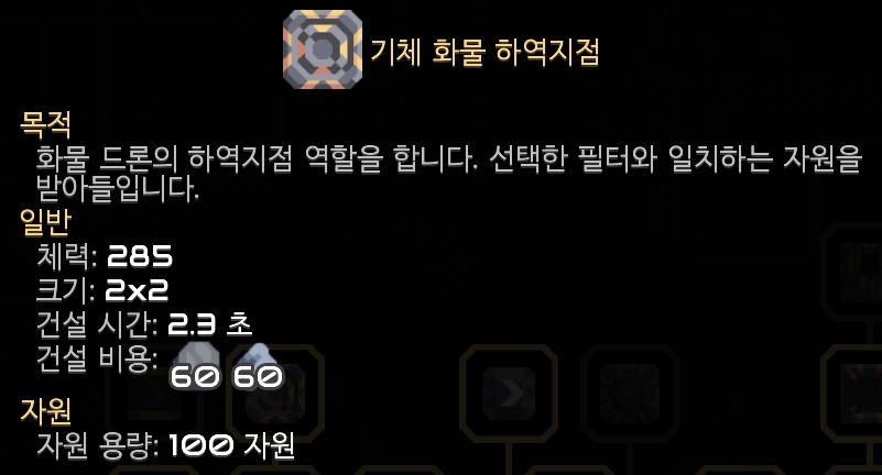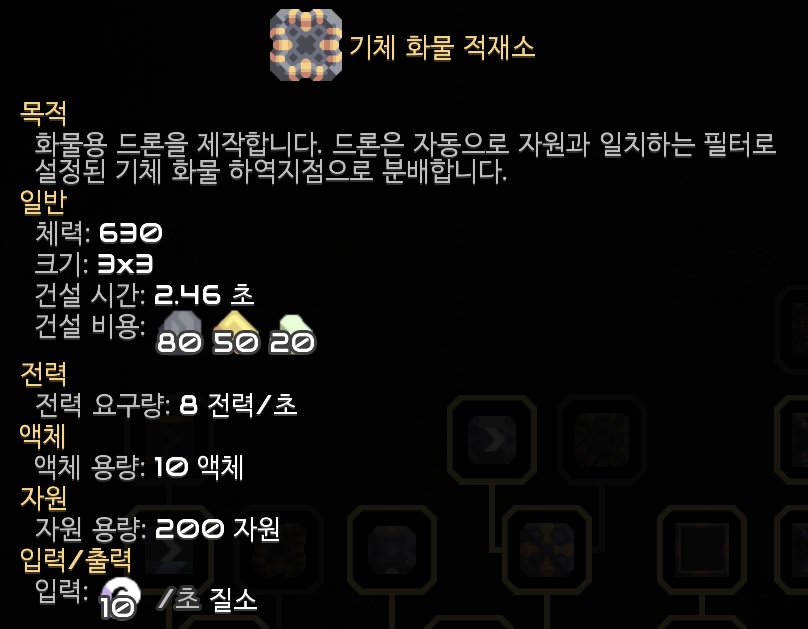기체 화물 적재소에 자원을 넣으면 드론이 이동하며 기체 화물 하역지점으로 자원을 옮기나 봅니다. 처음 보는 자원인 질소가 필요하네요.