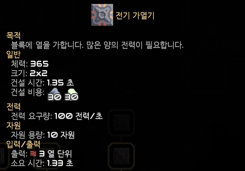 건설에 필요한 만큼의 산화물이 모여 화학적 연소실을 하나씩 차근차근 건설합니다. 전력이 +2.3k/s로 안정화가 되었습니다.
