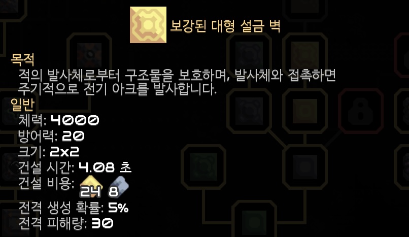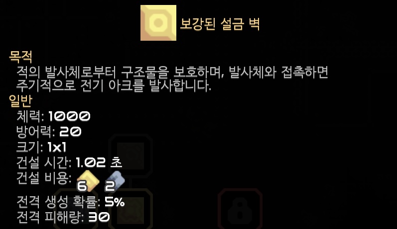 보강된 설금 벽과 보강된 대형 설금 벽은 세르플로 행성의 것들과 거의 똑같으나 체력이 조금 더 높고 전격 피해량이 각각 10만큼 더 높습니다. 아크 생성 확률은 5%로 모두 동일하네요.