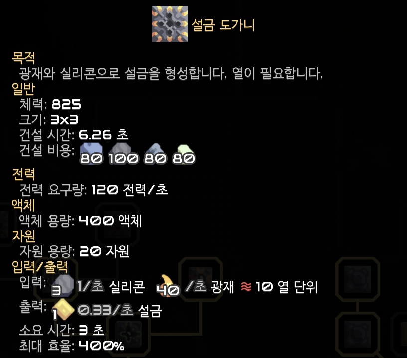 드디어 해금된 설금! 설금은 설금 도가니에서 실리콘과 광재를 재료로 사용하여 만들어집니다. 설금 생산에는 열이 별도로 필요하고 최대 효율을 400%까지 증가시킬 수 있습니다. 설금 도가니는 초당 3개의 설금을 생산하지만 최대 효율(40열)에 도달 시 초당 12개의 설금을 생산하겠네요.
