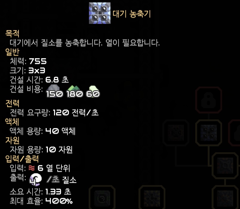 질소를 만들어 내는 대기 농축기입니다. 질소가 없어서 기체 화물 적재소를 사용하지 못했었는데, 지역 안내에 명시된 대로 이번에 사용이 가능할 것 같습니다.