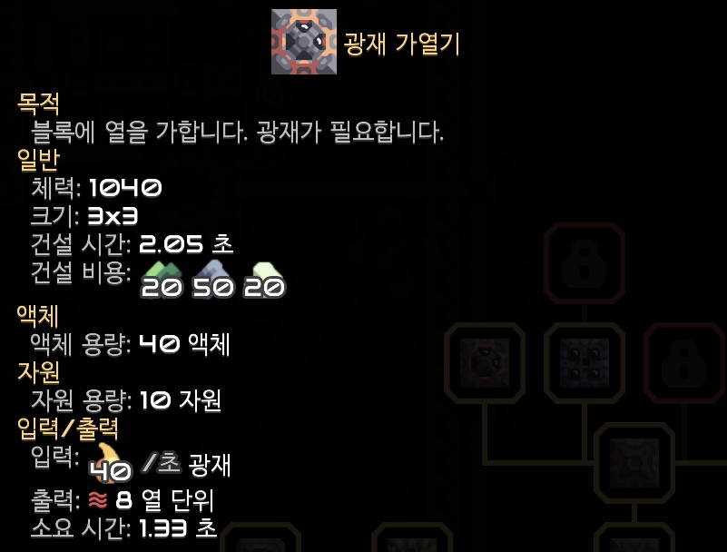 칼데라에서 해금된 광재 가열기는 대기 농축기와 잘 어울리는 녀석입니다. 열을 만듦에 있어 전기가 필요하지 않고 광재만 있으면 8 만큼의 열을 만들어 냅니다.