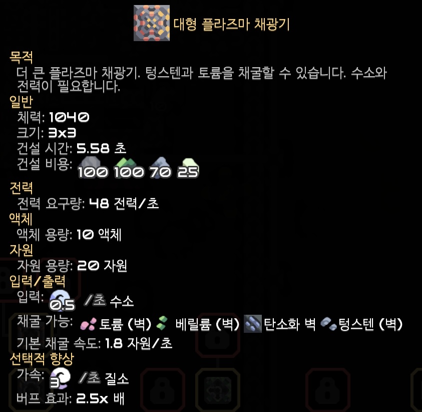 대형 플라즈마 채광기는 플라즈마 채광기가 업그레이드된 버전입니다. 전력 9/s, 채굴 속도 0.75/s의 일반 플라즈마 채광기보다 더 많은 전력을 요구하고 수소가 필수로 필요합니다. 질소로 가속까지 된다면 채광 속도가 비교도 되지 않을 만큼 빨라집니다.