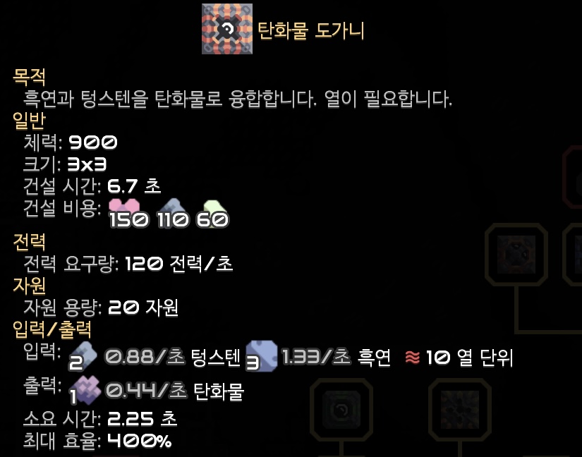 거점에 진입하자 해금된 콘텐츠, 탄화물 도가니입니다. 지역 안내에서 언급된 탄화물을 생산하고 텅스텐과 흑연이 재료로 필요합니다. 가동을 위한 열이 10 단위로 필요하네요. 효율은 설금 도가니와 동일하게 최대 400% 까지 적용이 가능합니다.