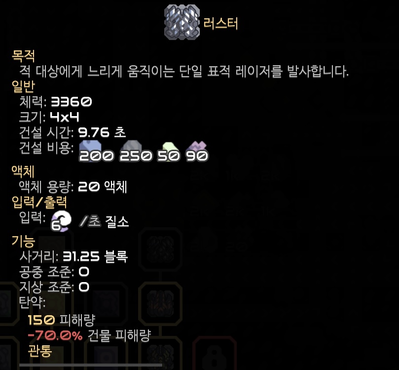 러스트와 비슷한 방식의 공격을 하는 서브리메이트의 설명에는 터렛의 초당 공격력이 명시되어 있는데, 러스터의 설명에는 피해량 150 이게 초당 공격력인지 뭔지 설명이 전혀 없네요.
