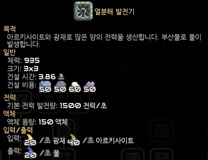 새로운 발전 시설은 언제나 반가워요. 열분해 발전기는 광재와 아르키사이트를 이용해 무려 1.5k/s나 되는 많은 양의 전력을 생산합니다. 게다가 초당 20만큼의 물이 발생하는데, 이로 전해조를 두 대 가동할 수 있겠네요.