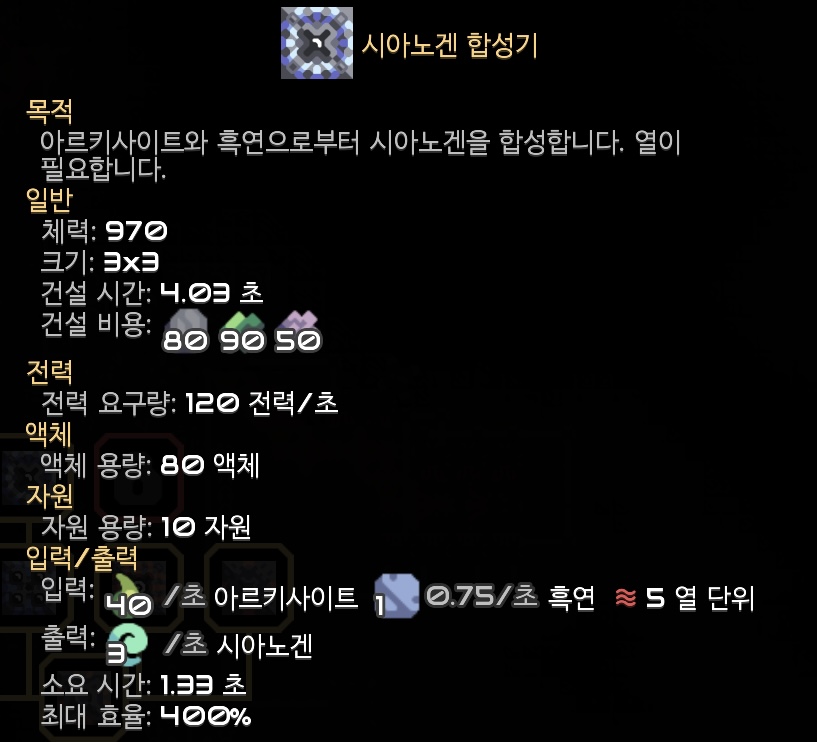 시아노겐 합성기는 아르키사이트와 흑연, 열로 시아노겐을 만듭니다. 20의 열로 최대 효율인 400% 까지 효율을 올리면 초당 12의 시아노겐을 생산할 수 있겠네요.