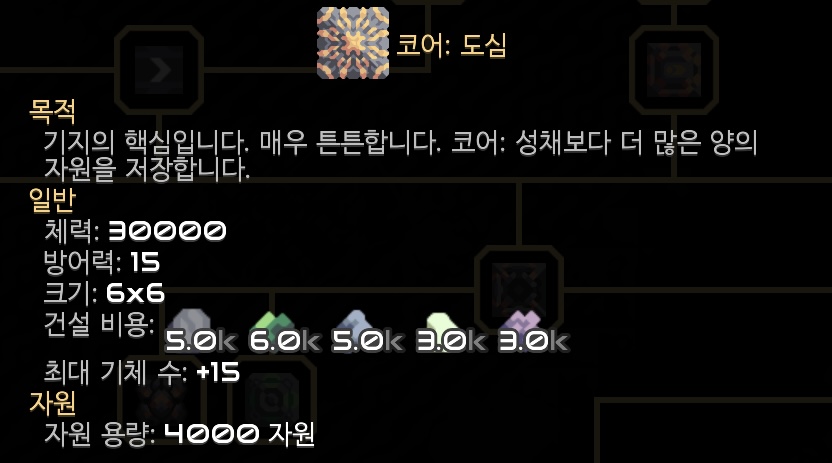 코어: 도심은 다음 연구가 없는 걸로 보아, 에르키아 행성 코어의 최종 단계인가 봅니다. 각 자원을 4,000개까지 저장할 수 있습니다.
