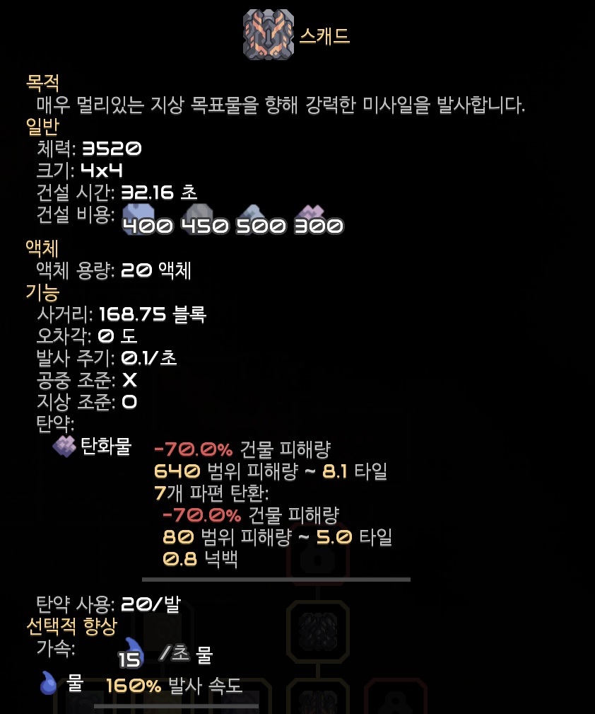 사거리가 168.75 블록으로 엄청납니다. 고급 자원인 탄화물을 20개씩이나, 10초마다 미사일 한 방으로 날려버리네요 ㅎㅎㅎㅎ 물까지 공급되어 발사 속도가 증가한다면 탄화물 소모량이 엄청나겠습니다.