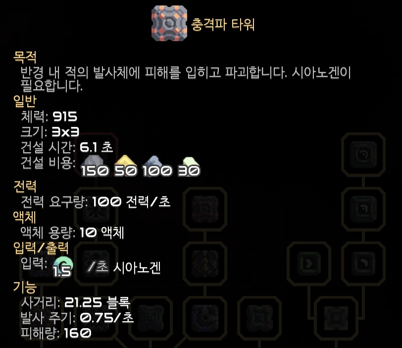 충격파 타워는 반경 내의 적 발사체를 파괴합니다. 시아노겐이라는 자원과 전력이 가동에 필요합니다. 사거리는 21.25 블록으로 그리 긴 편은 아니네요.
