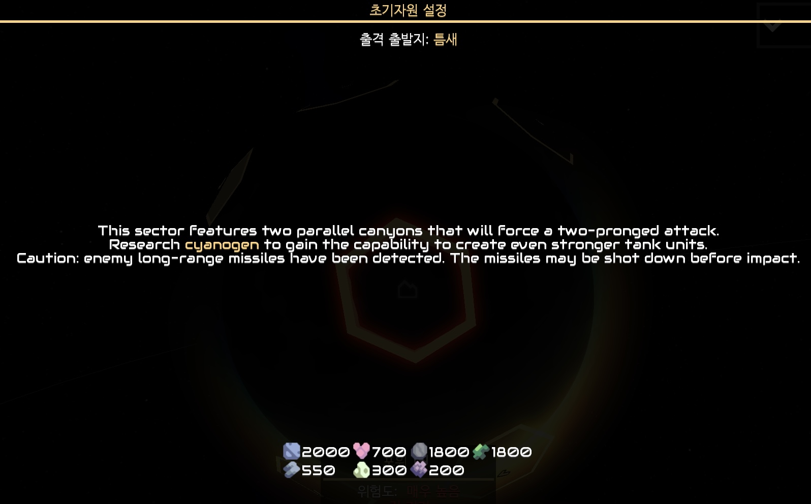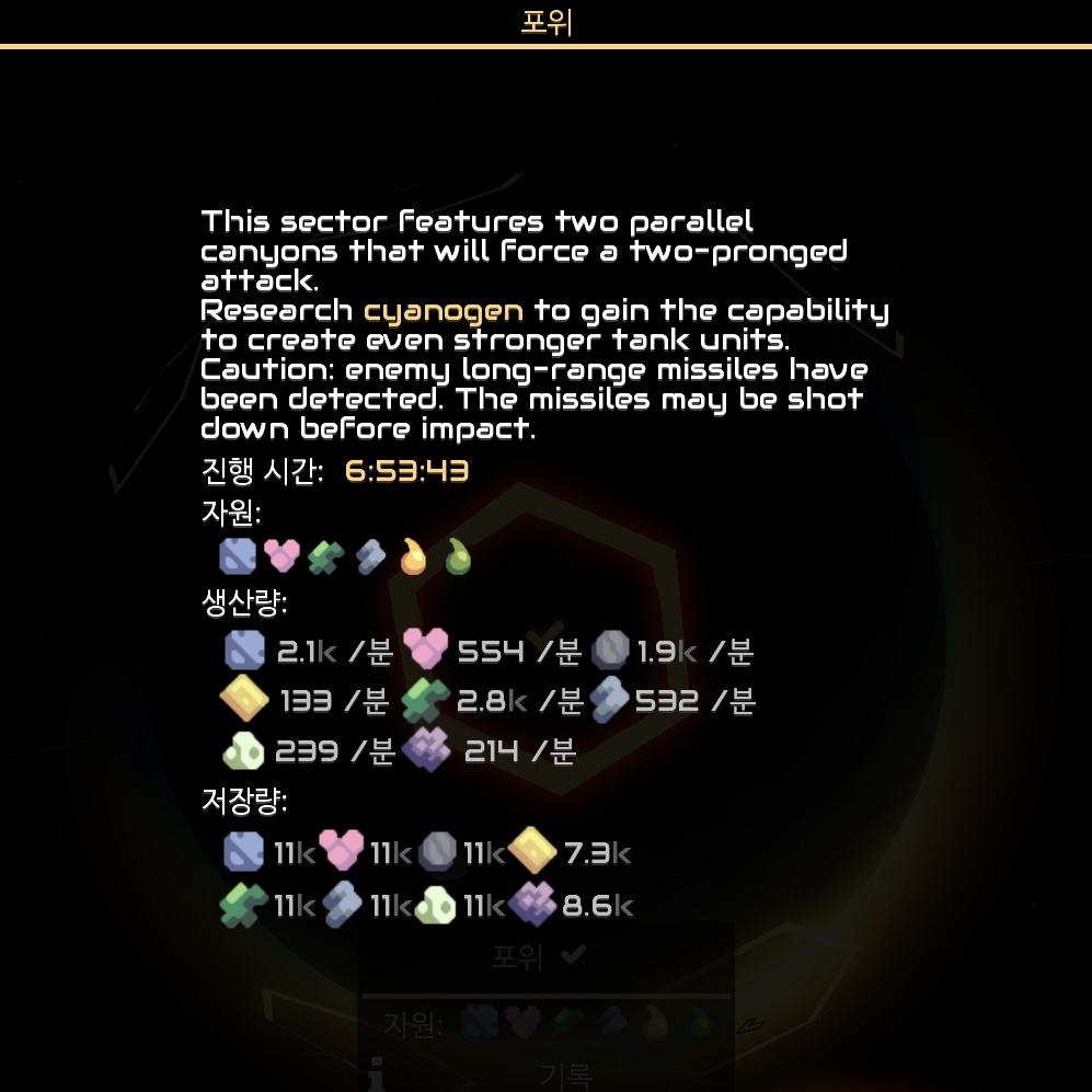 적 도착 시간까지의 10분이 훌쩍 지나버렸어요. 적의 도착 시간을 알리는 임무에서 ‘적의 생산량이 증가하고 있습니다’로 임무가 바뀌고 다시 10분이 카운트 다운됩니다. 그리고 진입이 불가능했던 영역이 해제됩니다.