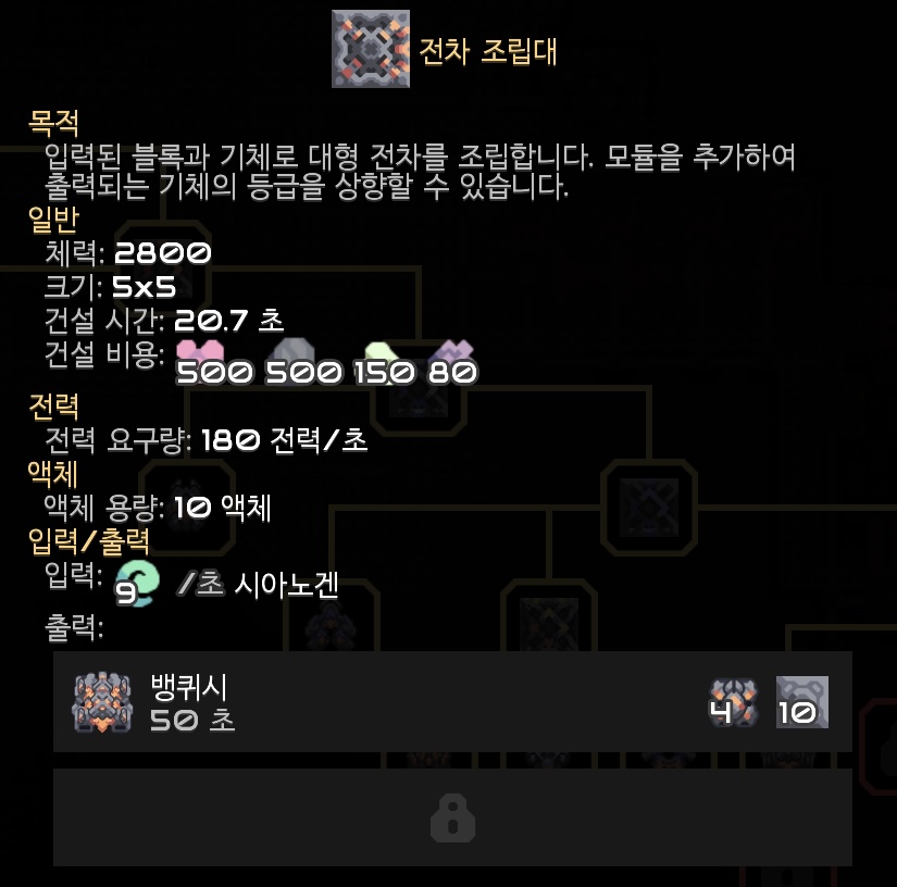 대형 전차를 조립하는 전차 조립대. 대형 전차인 뱅퀴시 한 대를 네 대의 스텔과 열 개의 대형 텅스텐 벽으로 조립합니다. 가동에 시아노겐이 필요합니다.