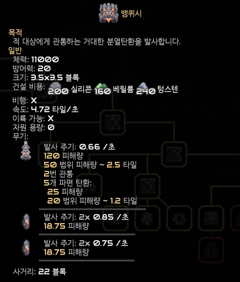 뱅퀴시는 대형 전차에 걸맞게 무려 11,000 이나 되는 엄청난 체력을 가지고 있습니다. 사거리는 긴 편이 아니네요. 뱅퀴시는 전차 조립대를 연구하자 자동으로 해금됐습니다.